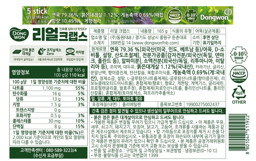 탱탱하고 쫀쫀한 리얼 크랩스예요. 은은한 단맛과 고소한 풍미로 입맛을 사로잡지요. 부드럽고 촉촉해서 결대로 잘 찢어진답니다. 그대로 드셔도 맛있고, 김밥이나 월남쌈에 넣어도 좋아요. 특유의 감칠맛으로 음식에 포인트가 될 거예요.