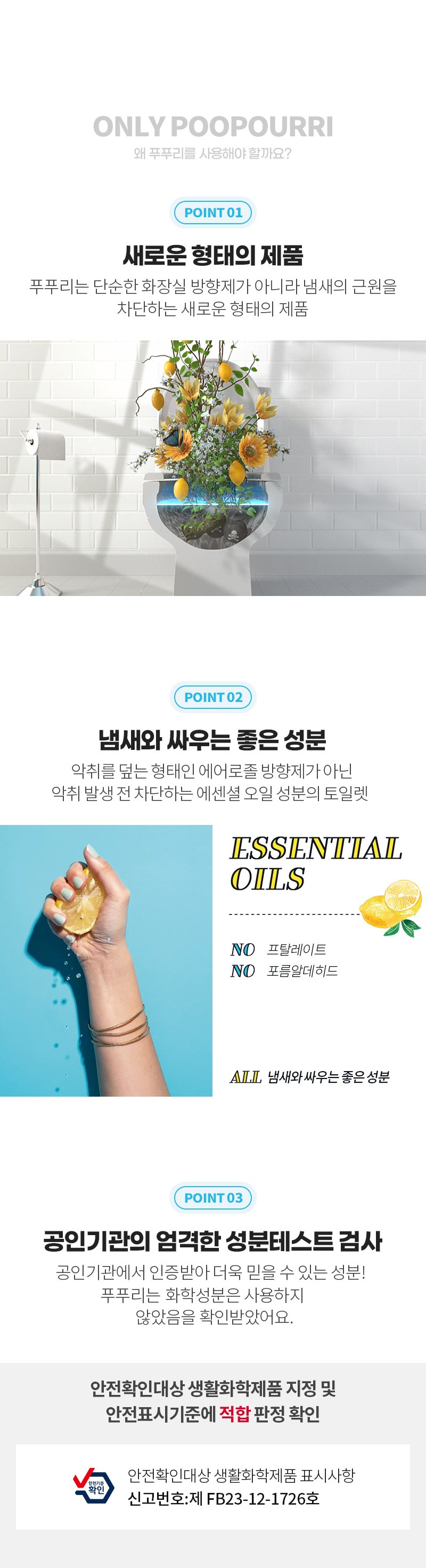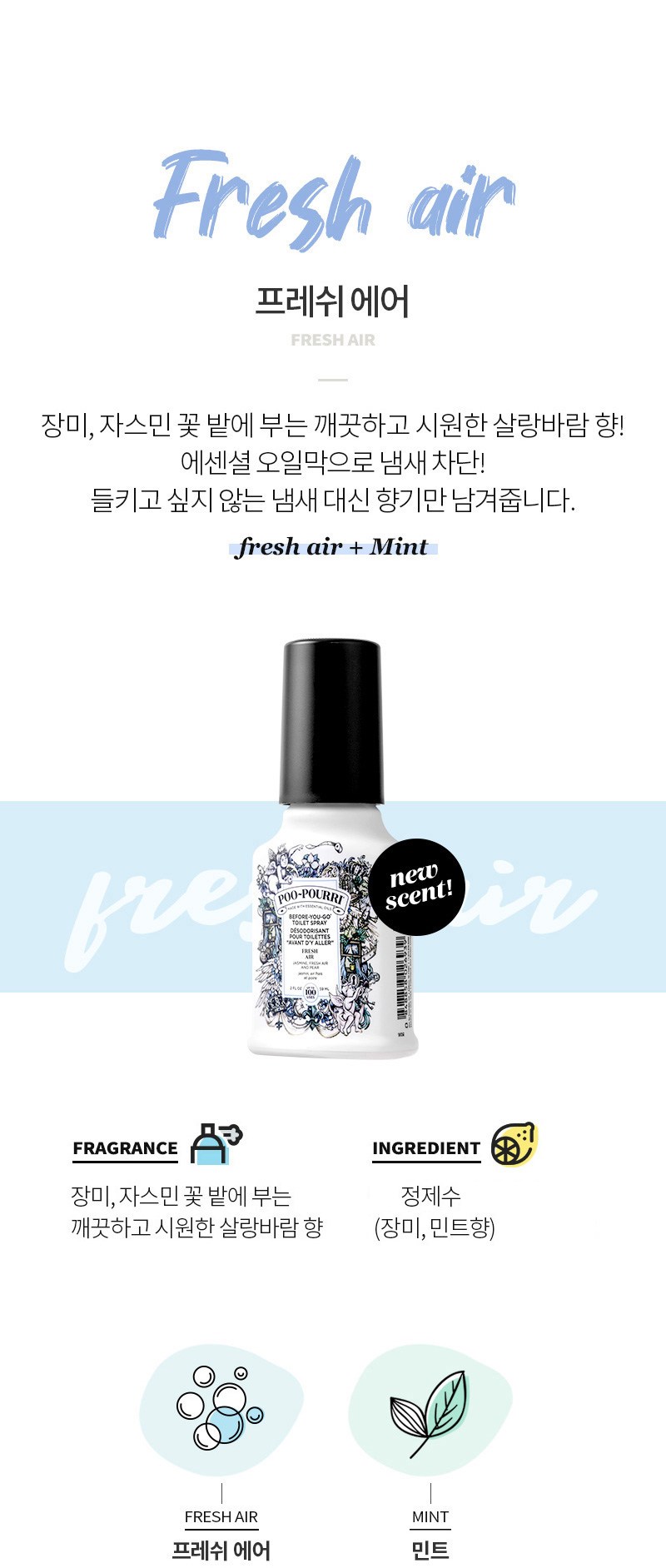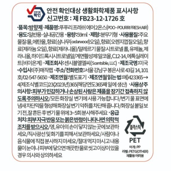 | 품목 및 제품명 | 방향제 / 푸푸리 프레쉬에어 2온스(POO~POURRI FRESH AIR) | 용도(표백제의 경우 계열을 함께표시) 및 제형 | 일반용-실내공간용 / 분무기형 |
