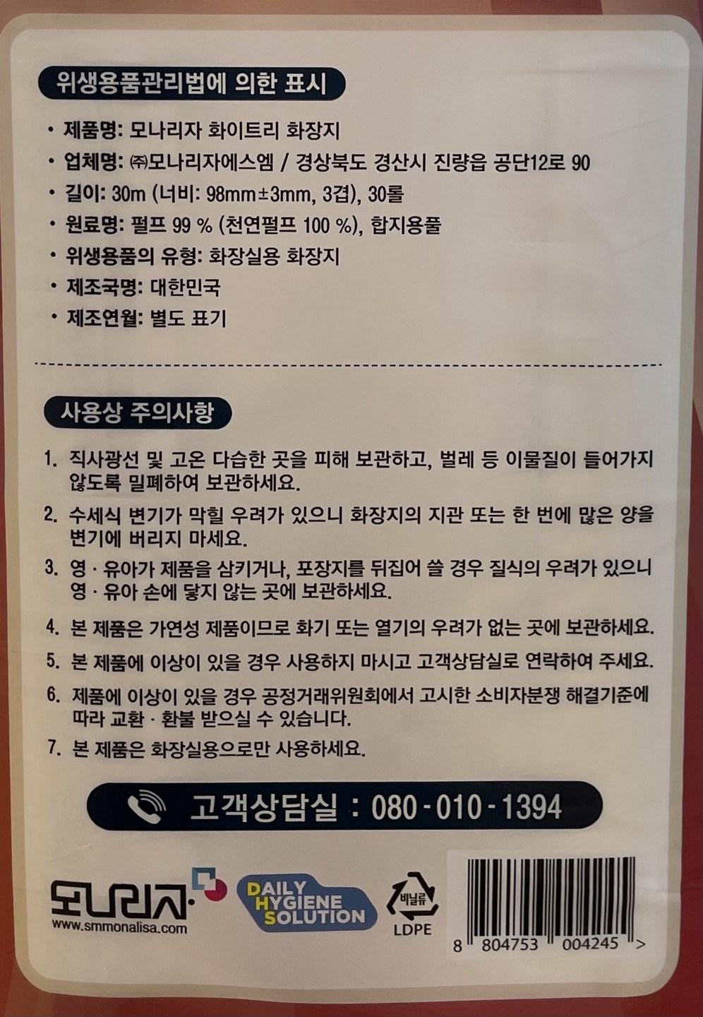 | 품명 및 모델명 | 모나리자 화이트리 화장지 | 인증/허가 사항 | 위생용품 |
