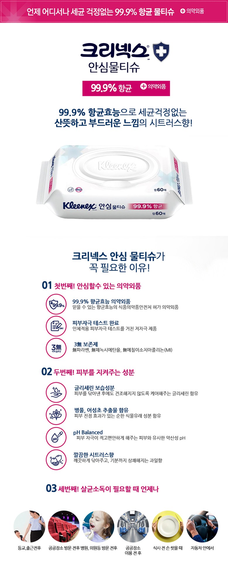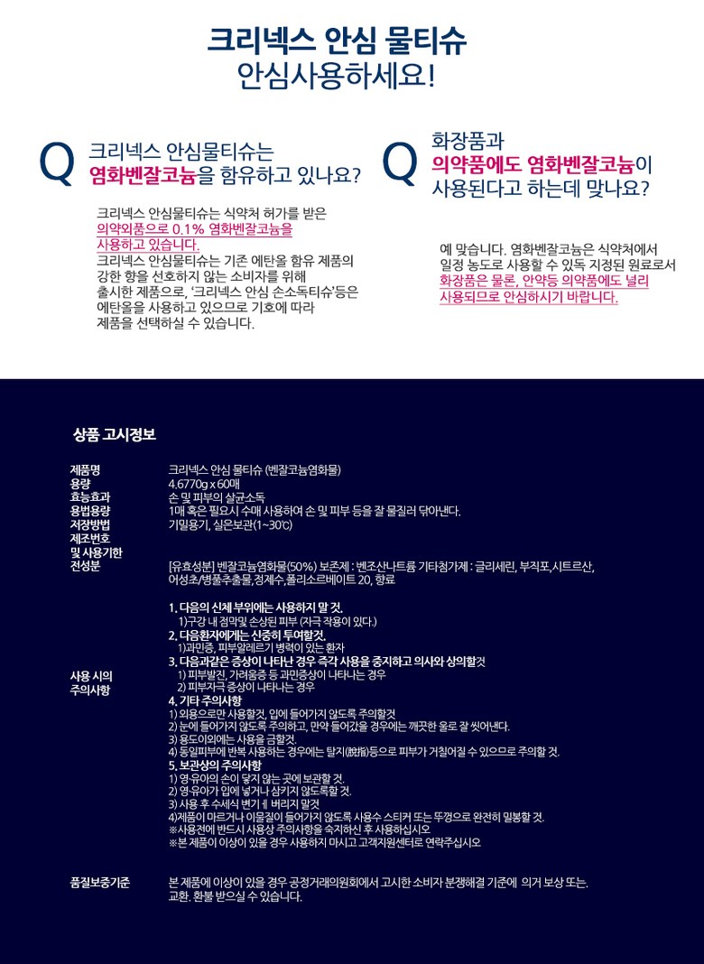 | 품명 및 모델명 | 크리넥스 안심물티슈 캡형 60매 | 인증/허가 사항 | 해당없음 |