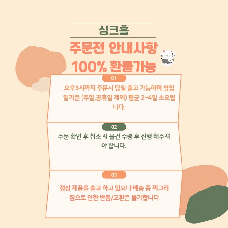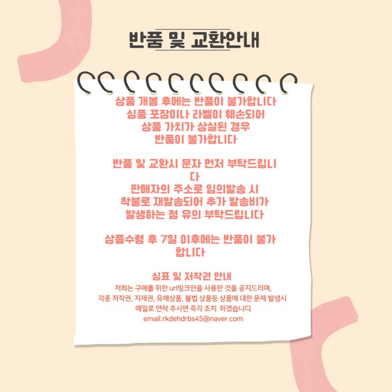 - ㆍ모니터 해상도의 차이로 인해 색상이나 이미지가 실제와 달라, 고객이 단순 변심으로 교환/반품을 무료로 요청하는 경우