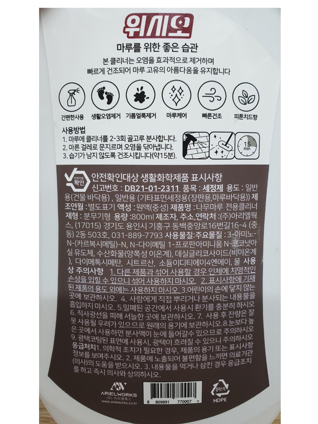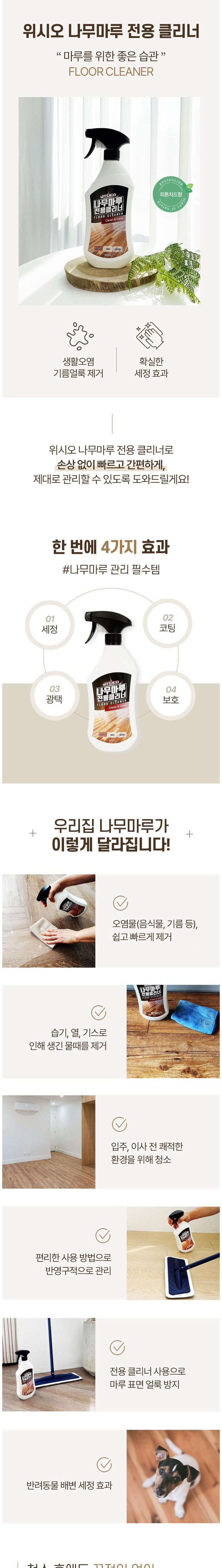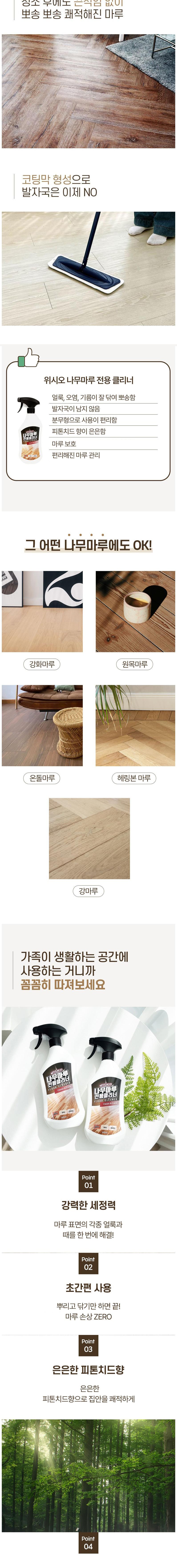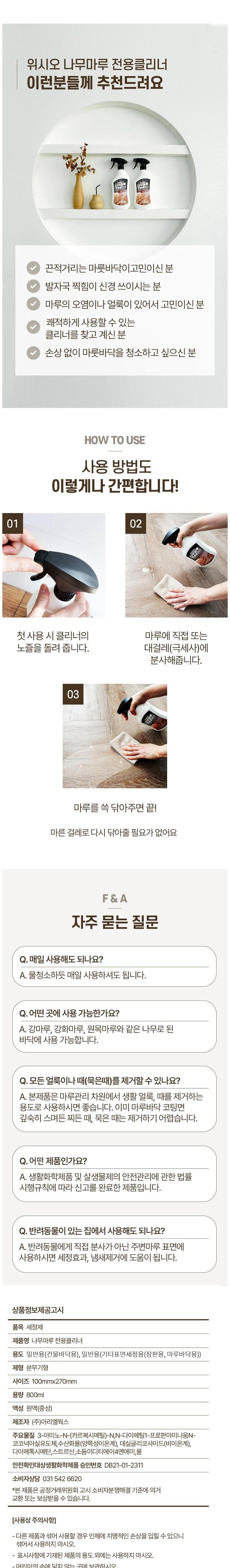 | 품목 및 제품명 | 세정제 / 나무마루 전용클리너 | 용도(표백제의 경우 계열을 함께표시) 및 제형 | 일반용(건물바닥용), 일반용(기타표면세정용(장판용, 마루바닥용)) / 분무기형 |