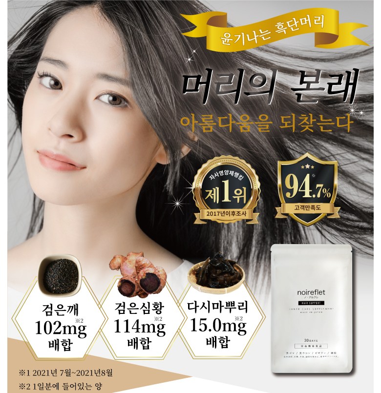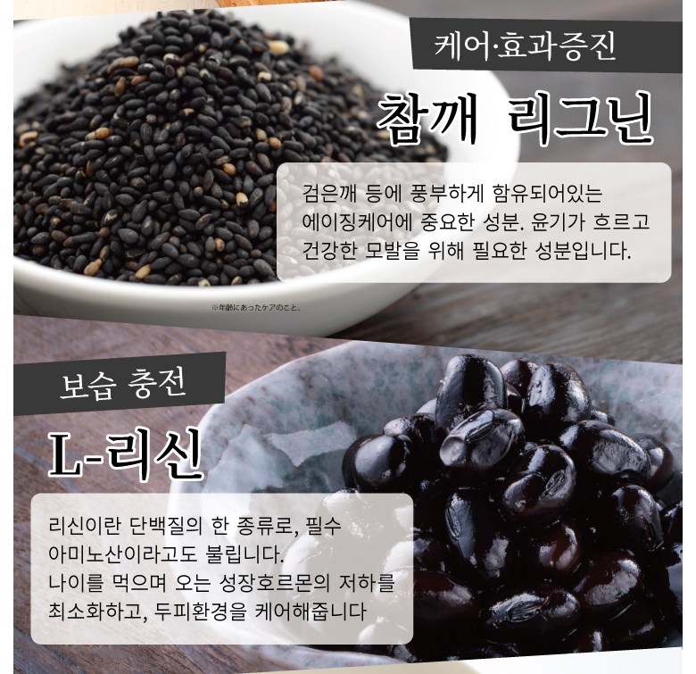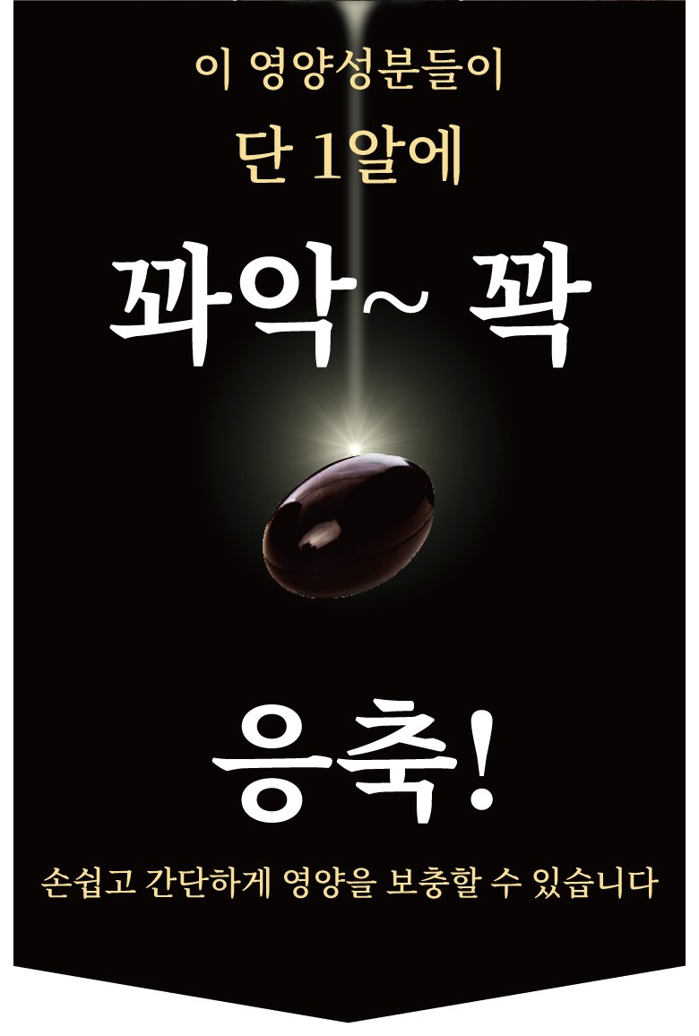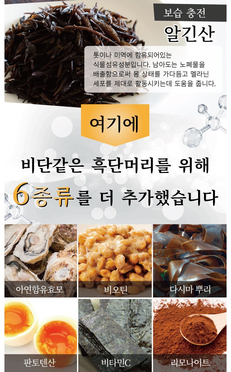 | 포장단위별 내용물의 용량(중량), 수량 | 40.5g [1정당 450g×90정] | 원재료명 및 함량 | 잇꽃유, 검은 심황(끄라차이담), 검은깨, 아연함유효모, 다시마 뿌리 분말/젤라틴, 글리세린, L-리신염산염, 글리세린지방산에스테르, L-아르기닌, 비오틴, 카라멜색소, 추출V.E, 나이아신, 판토텐산Ca, V.B1, V.B6, V.B2, V.A, V.C, 엽산, V.D, V.B12 |