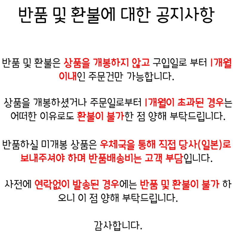 - ㆍ교환/반품에 관한 일반적인 사항은 판매자가 제시사항보다 관계법령이 우선합니다.