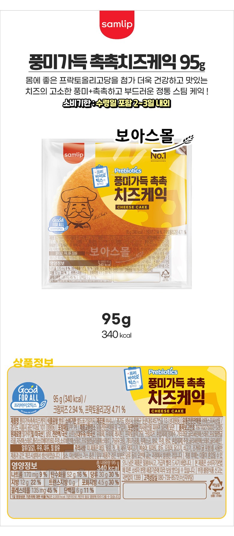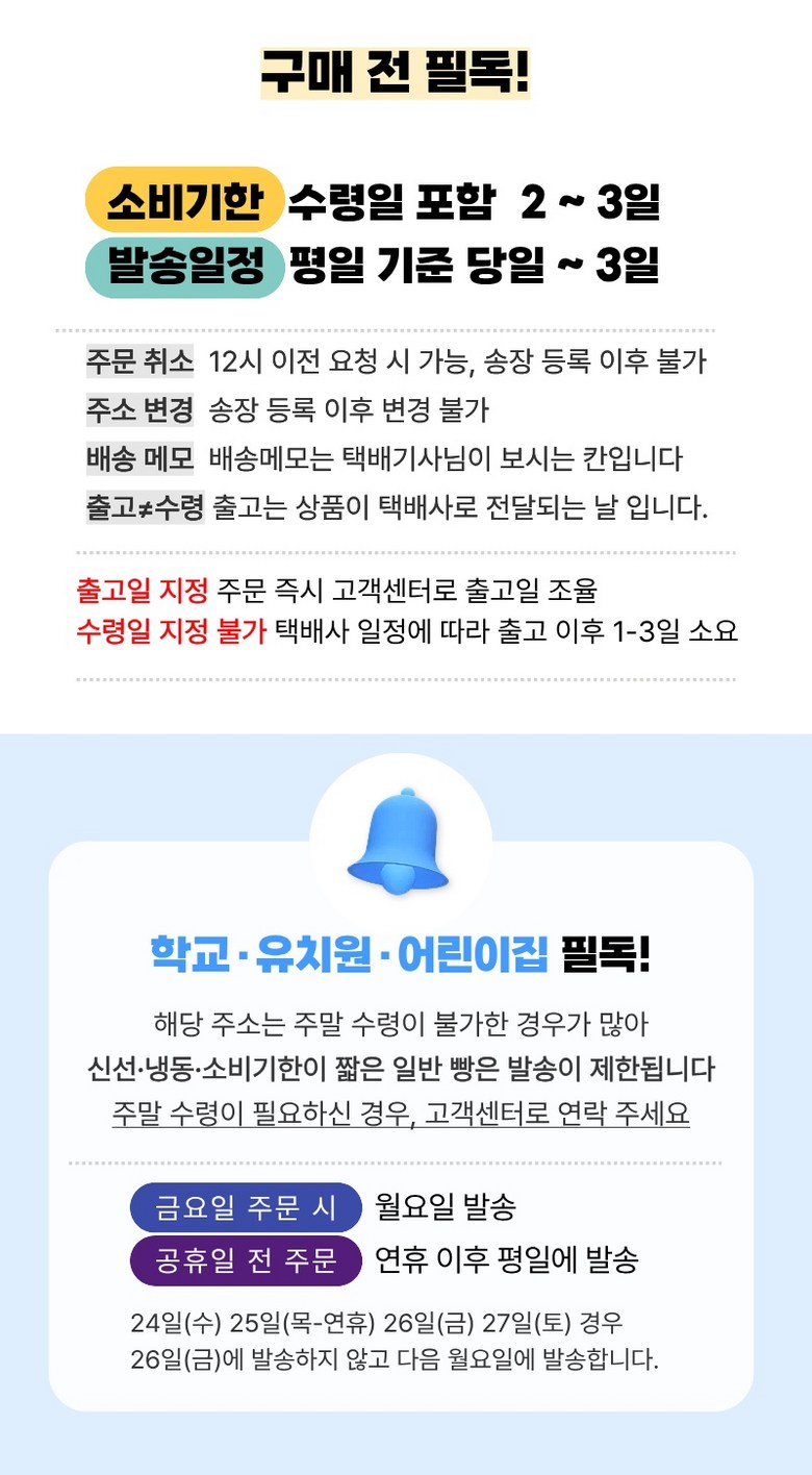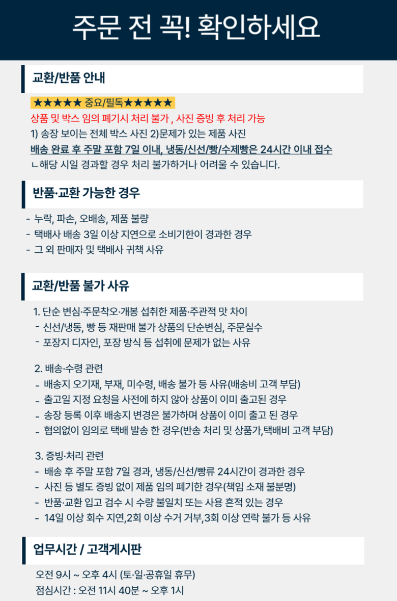 | 생산자 및 소재지 | 상품 상세페이지 참조 | 제조연월일, 소비기한 또는 품질유지기한 | 소비기한이 수령일 포함 2-3일 내외의 원래 짧은 제품으로 주문 후 제작되어 출고되는 식품 특성상 단순변심 및 취소/교환/반품이 불가하오니 신중한 구매 부탁드립니다 ! |