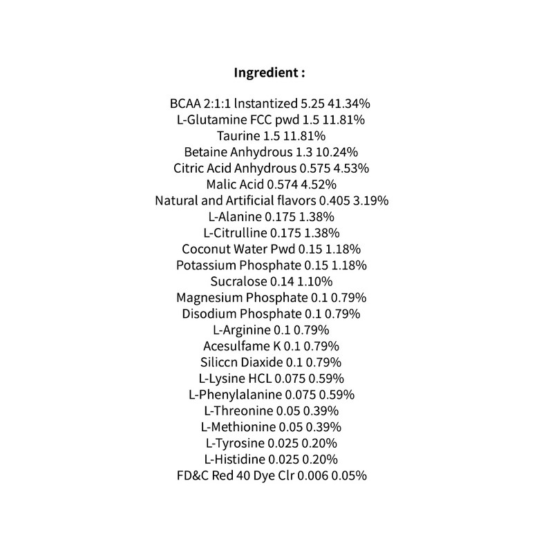 권장 사용: 건강 보조 식품으로 각 1 스쿱을 10-14ml의 물(기호에 따라 조절)을 넣고 잘 흔들어주세요. 훈련하는 날에는 운동 중 1스쿱, 운동 후 1스쿱을 섭취하세요. 훈련을 하지 않는 날에는 하루에 2스쿱을 섭취하세요. 최상의 결과를 얻으려면 매일 2스쿱을 사용하세요.