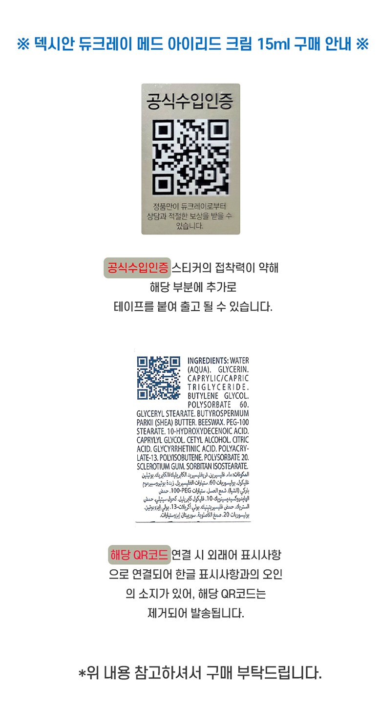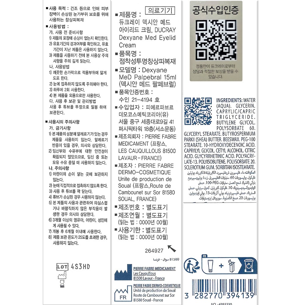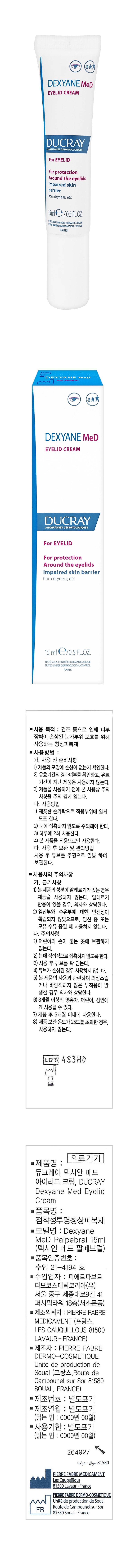 | 품명 및 모델명 | 점착성투명창상피복재 / Dexyane MeD Palpebral 15ml | 허가∙인증∙신고번호 (의료기기법에 따른 허가∙인증∙신고 대상 의료기기에 한함) | 품목허가번호 : 수인21-4194호 |