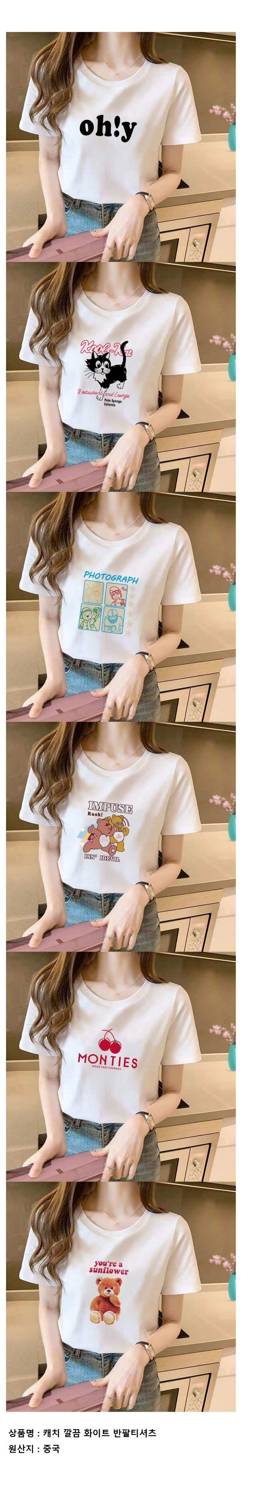 여성용 캐치 깔끔 반팔 티셔츠 고양이