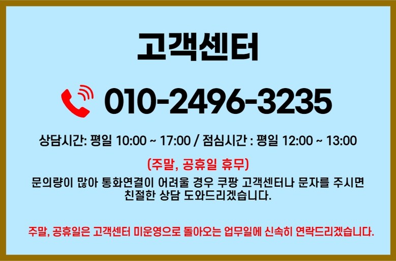 - ㆍ모니터 해상도의 차이로 인해 색상이나 이미지가 실제와 달라, 고객이 단순 변심으로 교환/반품을 무료로 요청하는 경우