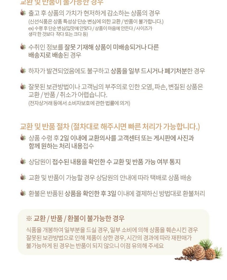 - ㆍ모니터 해상도의 차이로 인해 색상이나 이미지가 실제와 달라, 고객이 단순 변심으로 교환/반품을 무료로 요청하는 경우