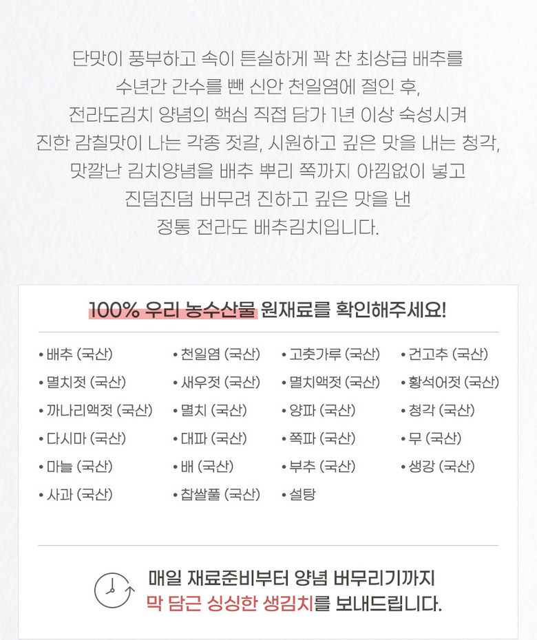 | 포장단위별 내용물의 용량(중량), 수량 | 2kg, 3kg, 5kg | 원재료명 및 함량 | 절임배추72.4%[배추98%(국산),천일염(국산)],다시마육수(국산),고춧가루(국산),무(국산),찹쌀풀(국산),멸치젓(국산),새우젓(국산),양파(국산),마늘(국산),멸치액젓(국산),설탕,쪽파(국산),건고추(국산),까나리액젓(국산),사과(국산),부추(국산),배(국산),황석어젓(국산),청각(국산),생강(국산),대파(국산) |