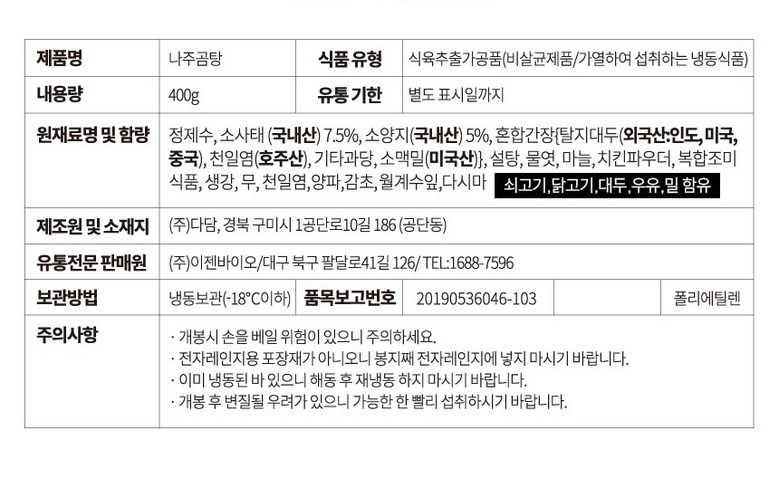 | 제조연월일, 소비기한 또는 품질유지기한 | 상품 상세페이지 참조 | 세부 품목군별 표시사항 | 상품 상세페이지 참조 |