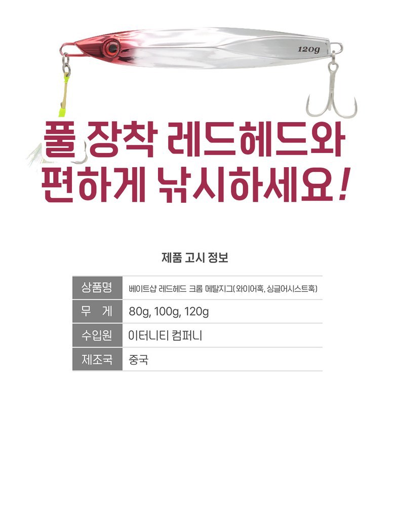 | 품명 및 모델명 | 베이트샵 레드헤드 크롬 메탈지그 | 인증/허가 사항 | 해당없음 |