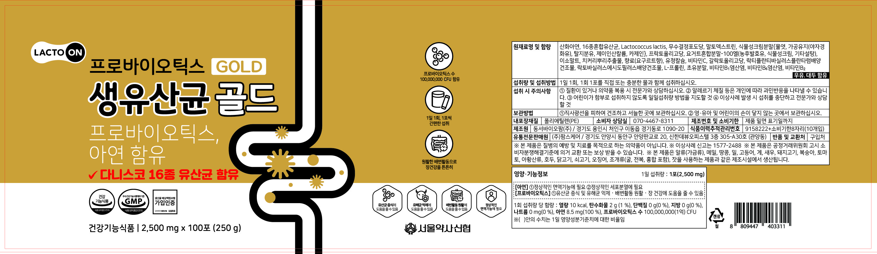 | 제품명 | 프로바이오틱스 생유산균 골드 | 제조업소의 명칭과 소재지 | 컨텐츠 참조 |