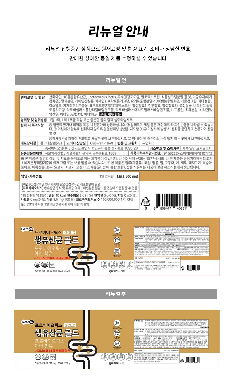 | 원료명 및 함량 | 리뉴얼 전: 컨텐츠 참조/ 리뉴얼 후: 컨텐츠 참조 | 영양정보 | 컨텐츠 참조 |