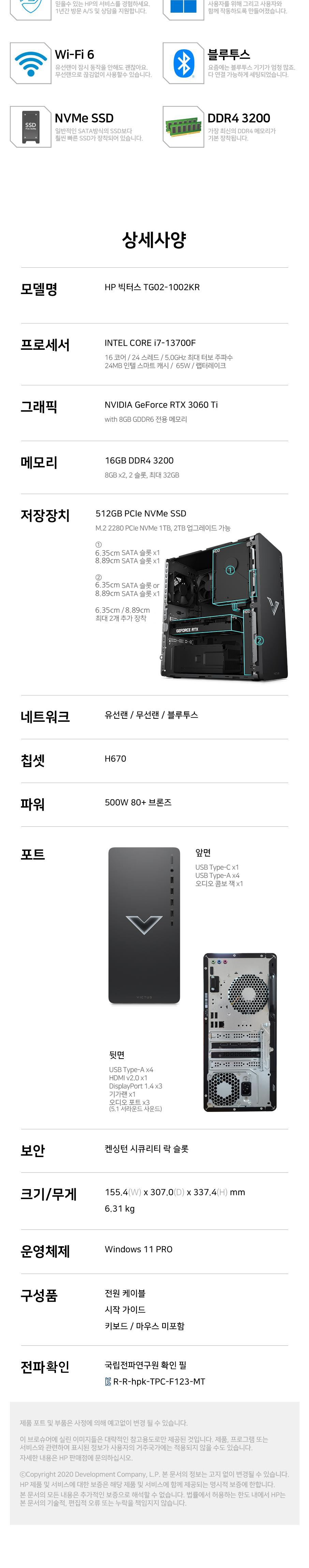 | 품명 및 모델명 | HP 빅터스 데스크탑 TG02-1002KR / Victus by HP 15L Gaming Desktop PC | KC 인증정보 | 본품: R-R-hpk-TPC-F123-MT / 전원공급장치: ZU10131-20001, R-R-PPQ-PA-5501-2HA / 전원케이블: SU01017-18001 |