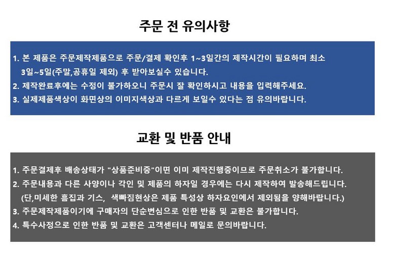 - ㆍ모니터 해상도의 차이로 인해 색상이나 이미지가 실제와 달라, 고객이 단순 변심으로 교환/반품을 무료로 요청하는 경우
