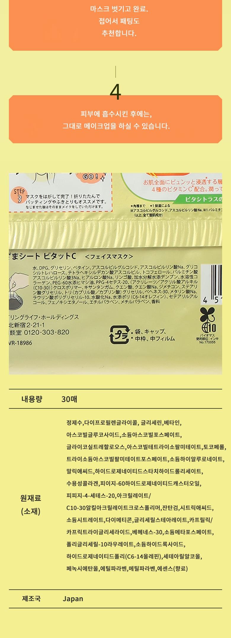 (1) 뚜껑을 열고 마스크의 가장자리를 잡고 꺼냅니다. (2) 마스크를 쭉 펴면서 얼굴에 얹고, 좌우로 늘리면서 밀착시키고 약 1분 둡니다. ※건조가 신경이 쓰이는 분은 5~10분 정도 두면 보다 효과적입니다. (3) 마스크를 떼어내면 끝. 떼어낸 마스크를 접어서 두드려 주는 것도 추천합니다. (4) 피부에 흡수된 후, 바로 메이크업할 수 있습니다.
