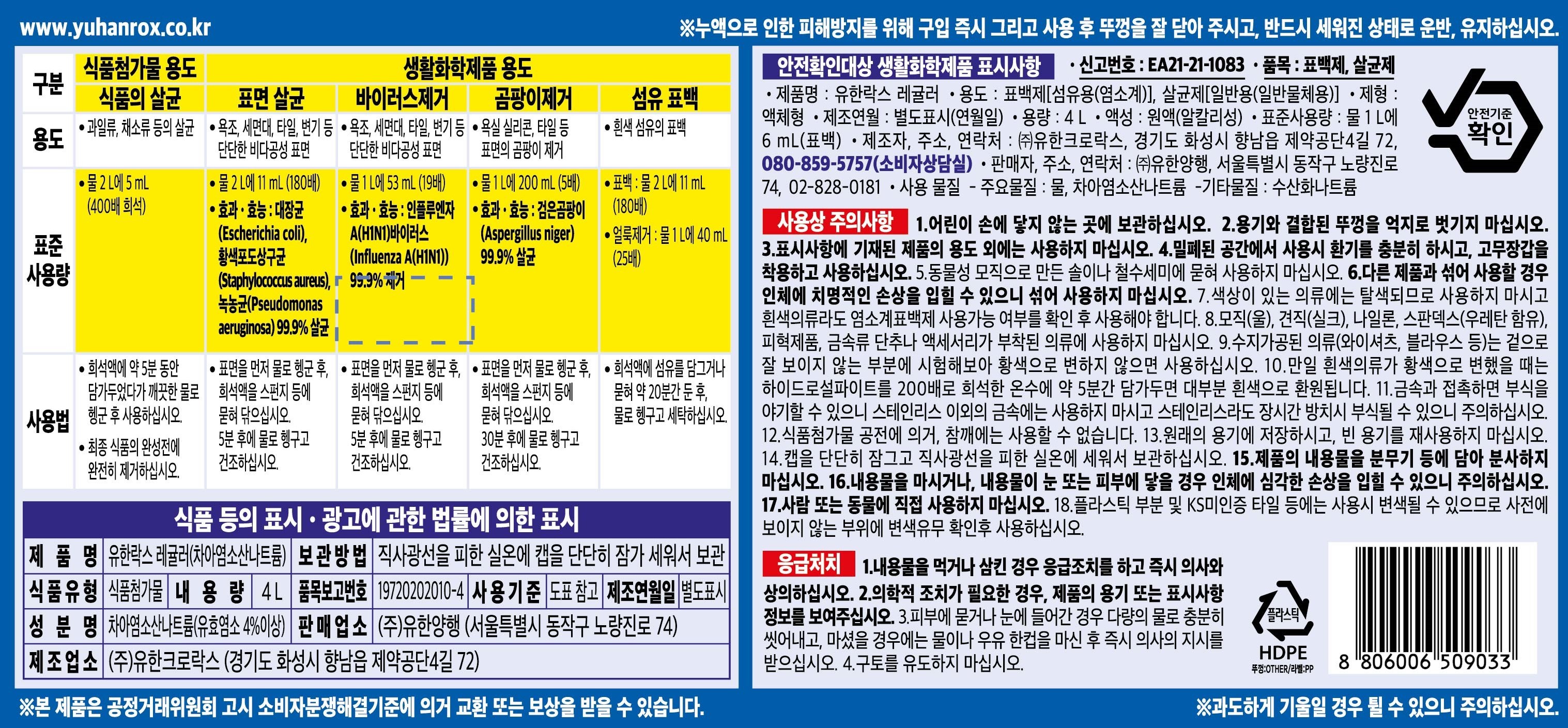 | 품목 및 제품명 | 표백제, 살균제 / 유한락스 레귤러 | 용도(표백제의 경우 계열을 함께표시) 및 제형 | 표백제[섬유용(염소계)], 살균제[일반용(일반물체용)] / 액체형 |