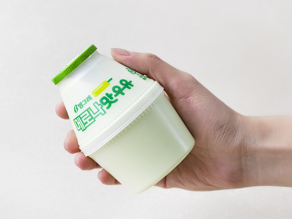 단지 모양의 용기에 담긴 빙그레 메로나맛 우유. 어떤 고민 끝에 단지 모양으로 태어났을까요? 처음 출시된 시기는 우리나라의 급격한 산업화 시대였어요. 농촌을 떠난 고달픈 도시 생활 업자들이 고향을 떠올릴 수 있도록 넉넉한 항아리 모양으로 디자인된 것이 시작이었답니다.