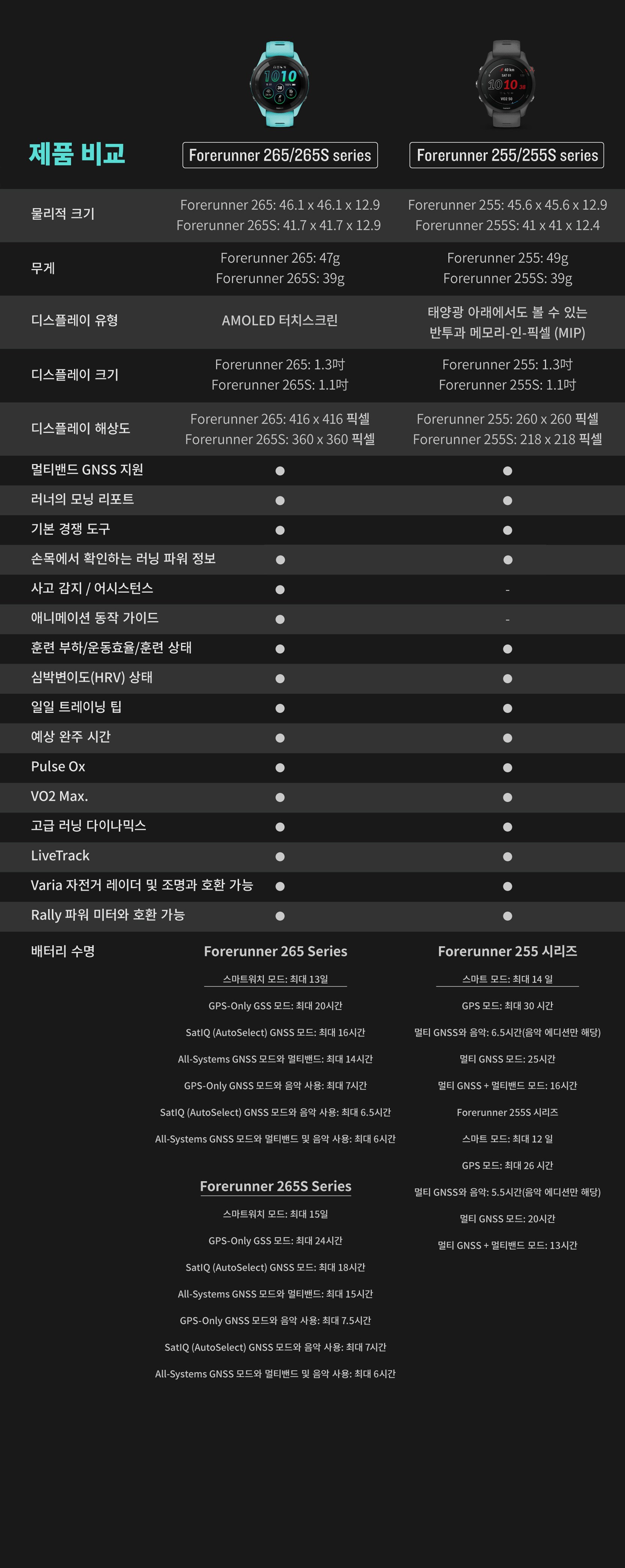 | 품명 및 모델명 | Forerunner265 / A04452 | KC 인증정보 | 본품 : R-C-GRm-A04452 | 전지 : YU10211-22017 |
