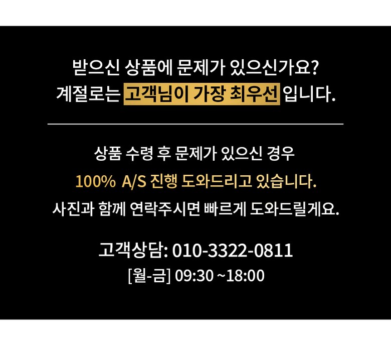 | 교환/반품 신청 기준일 | ㆍ단순변심에 의한 교환/반품은 제품 수령 후 7일 이내까지, 교환/반품 제한사항에 해당하지 않는 경우에만 가능 (배송비용과 교환/반품 비용 왕복배송비 고객부담) ㆍ상품의 내용이 표시·광고의 내용과 다른 경우에는 상품을 수령한 날부터 3개월 이내, 그 사실을 안 날 또는 알 수 있었던 날부터 |