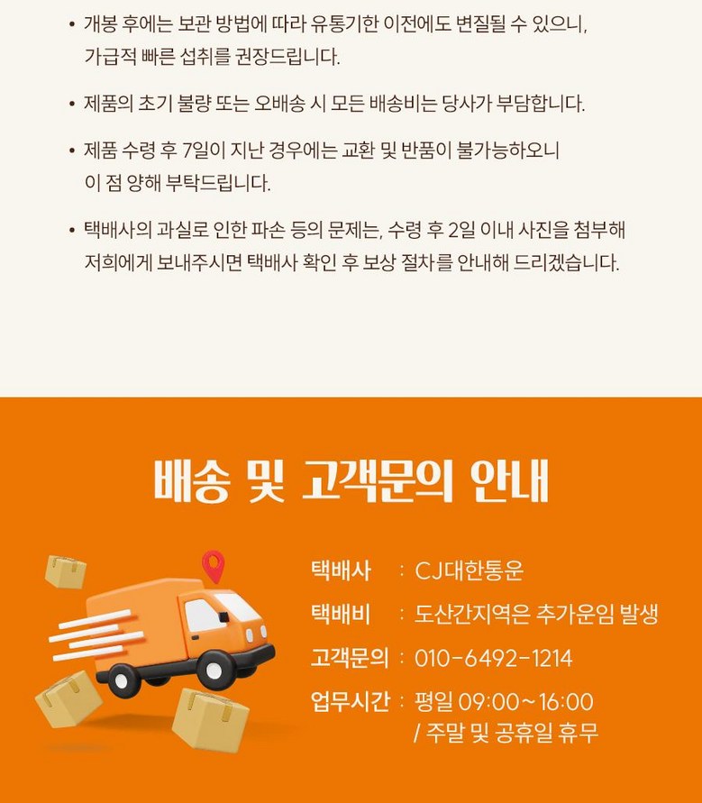 | 배송기간 | ㆍ도서산간 지역 등은 배송에 3-5일이 더 소요될 수 있습니다. - 천재지변, 물량 수급 변동 등 예외적인 사유 발생 시, 다소 지연될 수 있는 점 양해 부탁드립니다. | ||