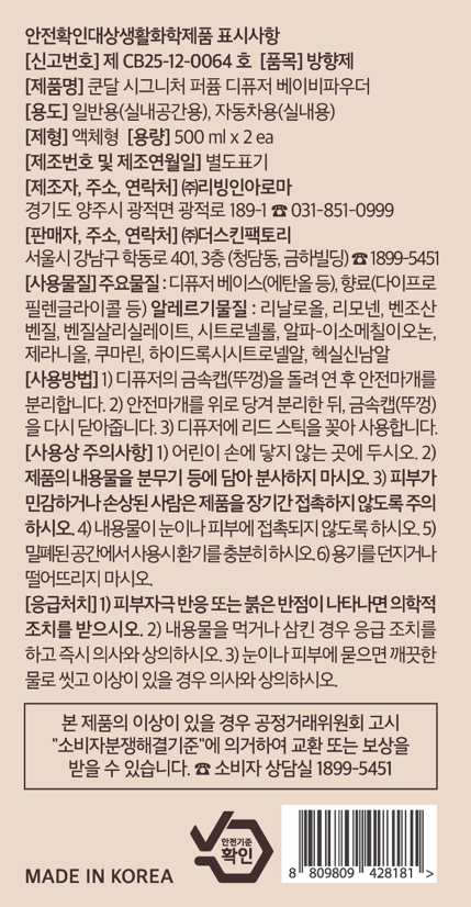 | 품목 및 제품명 | 방향제 / 쿤달 시그니처 퍼퓸 디퓨저 베이비파우더 | 용도(표백제의 경우 계열을 함께표시) 및 제형 | 일반용(실내공간용), 자동차용(실내용) / 액체형 |