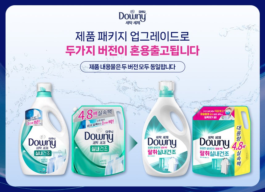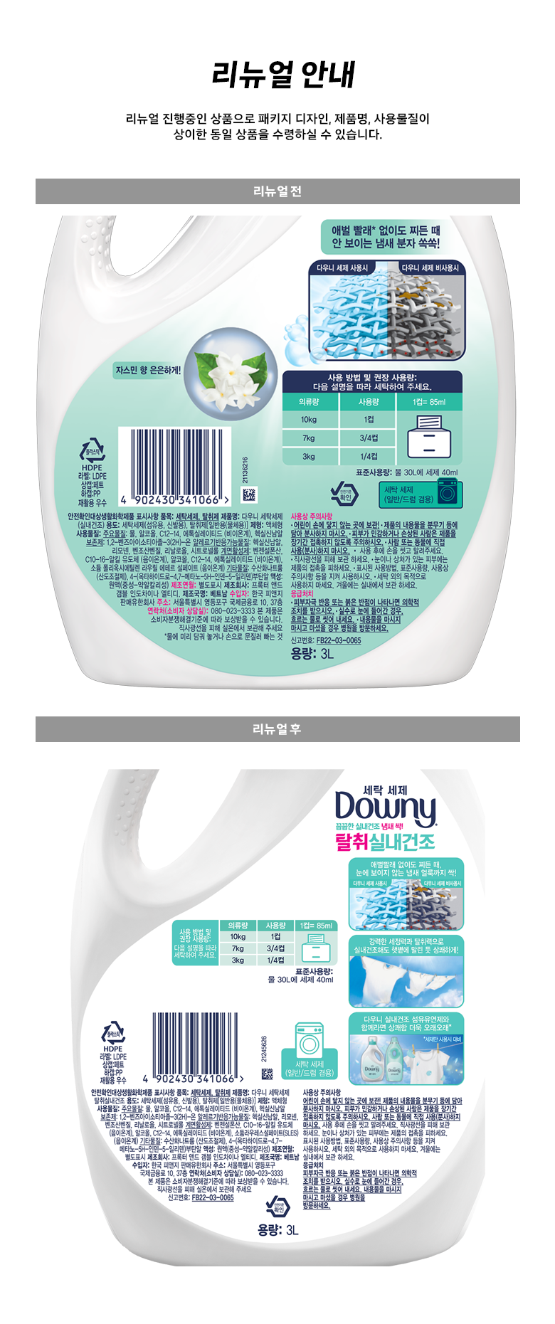 | 품목 및 제품명 | 세탁세제,탈취제/ 다우니 세탁세제 탈취실내건조 | 용도(표백제의 경우 계열을 함께표시) 및 제형 | 세탁세제(섬유용,신발용),탈취제[일반용(물체용)]/액체용 |