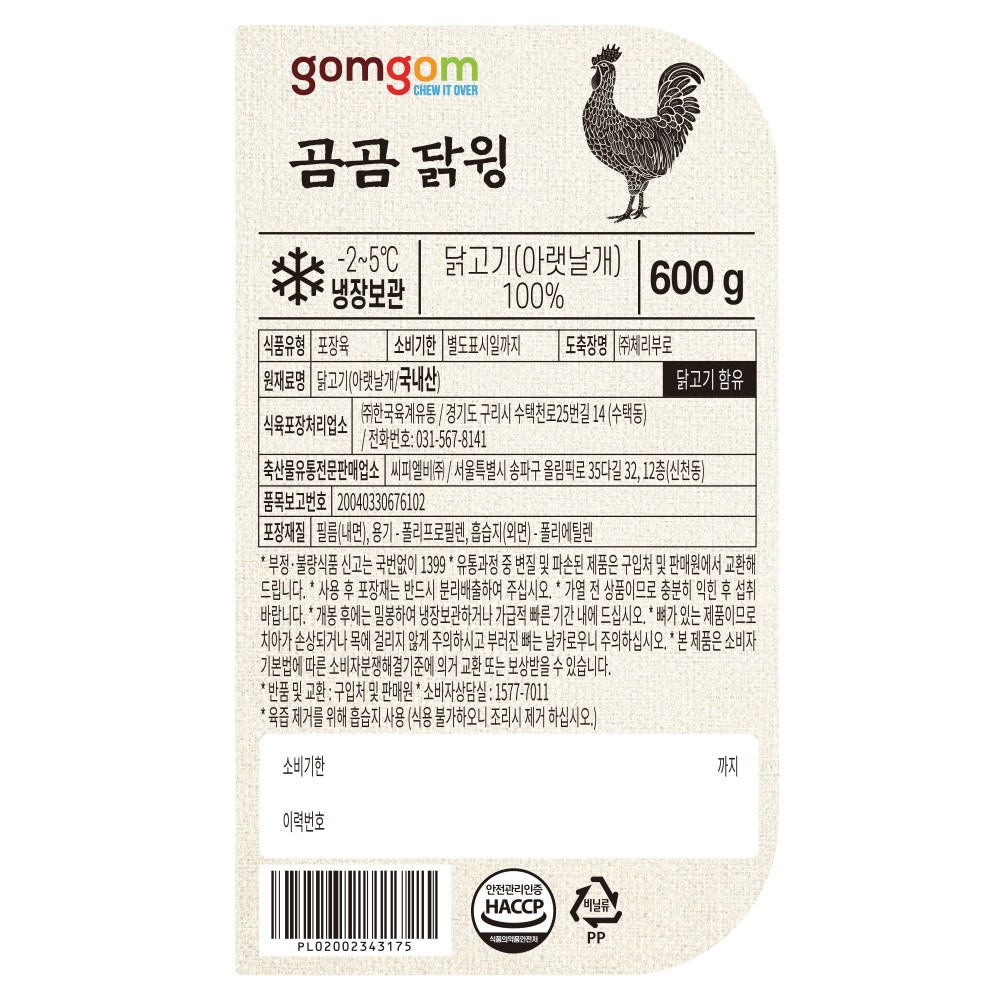 | 품목 또는 명칭 | 곰곰 닭윙 | 포장단위별 내용물의 용량(중량),수량,크기 | 600g x 4개,1개 |