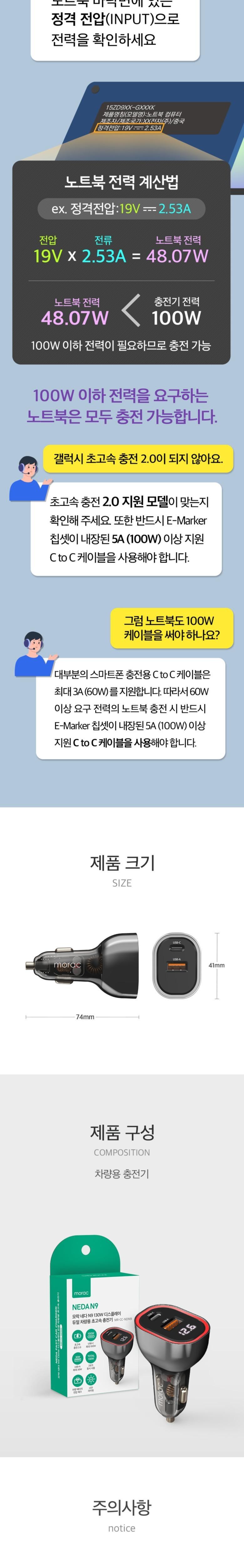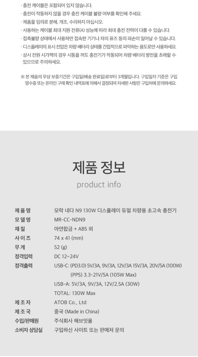 | 품명 및 모델명 | 모락 네다 N9 130W 디스플레이 듀얼 차량용 초고속 충전기 MR-CC-NDN9 | 동일모델 출시년월 | 2023.03 |