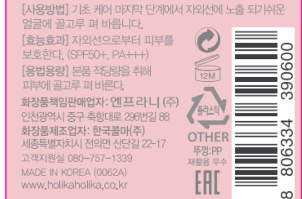 | 화장품제조업자, 화장품책임판매업자 및 맞춤형화장품판매업자 | 컨텐츠 참조 | 제조국 | 한국 |