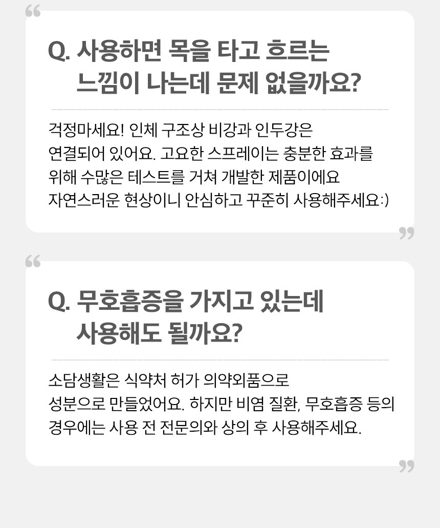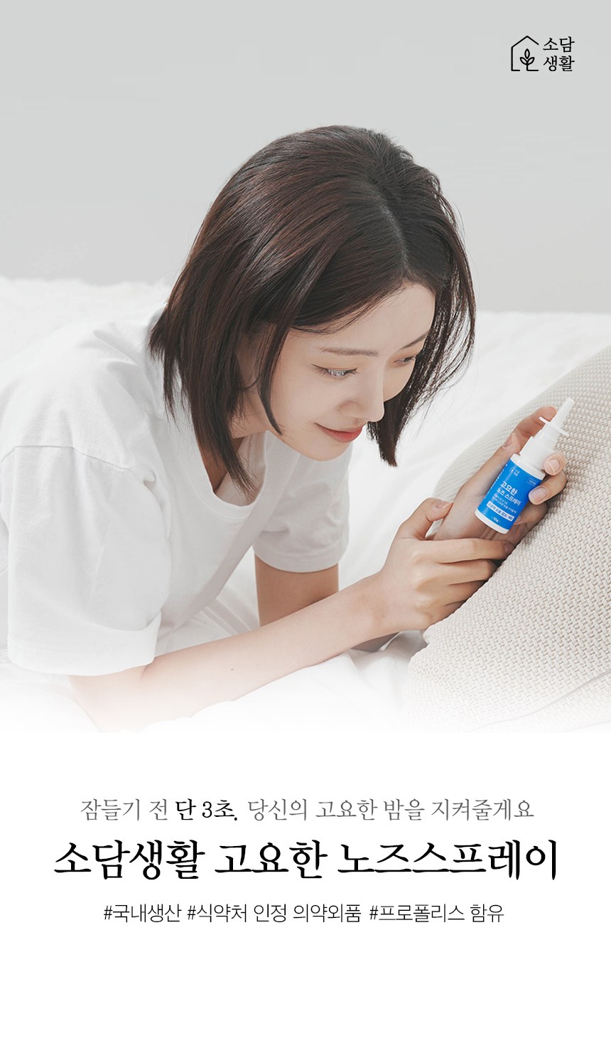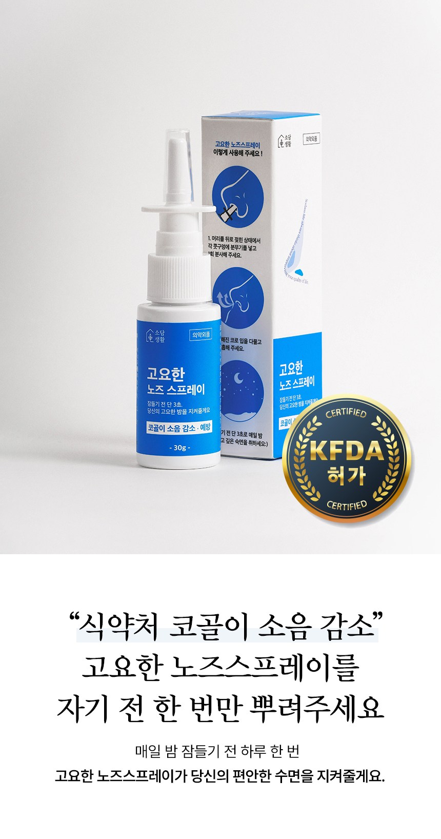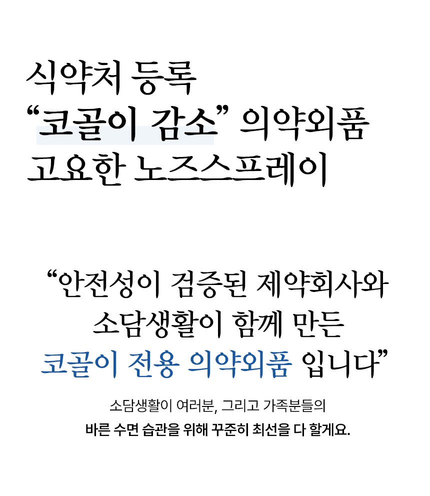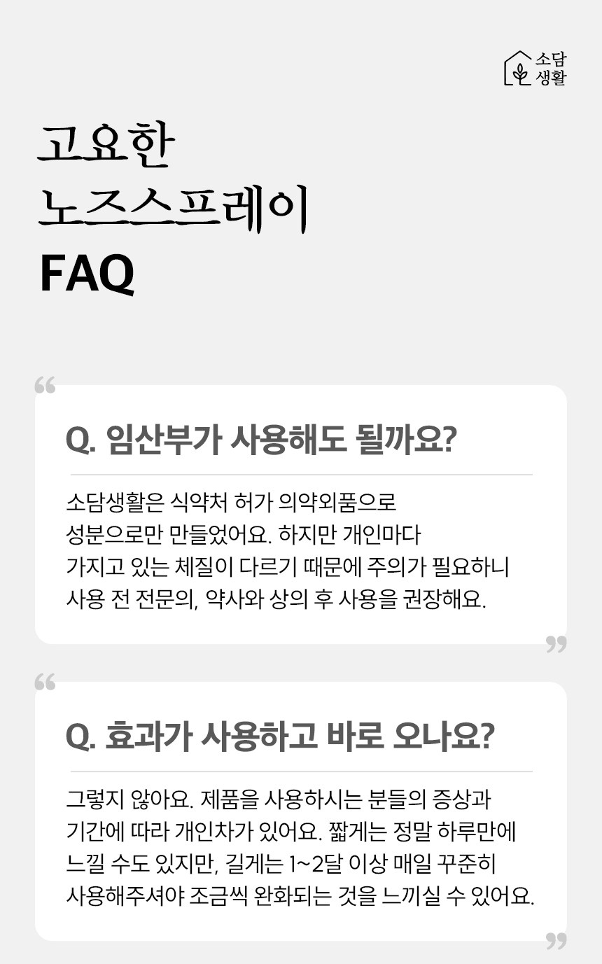 | 품명 및 모델명 | 소담생활 고요한 노즈스프레이(잔탄검) | 인증/허가 사항 | 의약외품 |