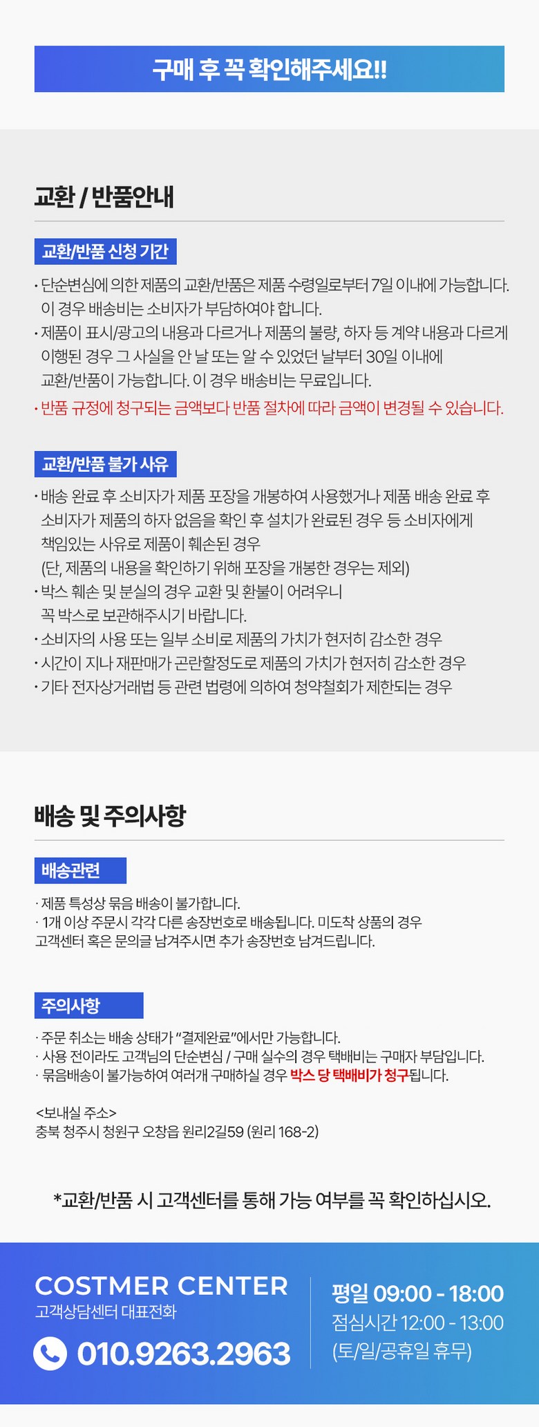 | 교환/반품 신청 기준일 | ㆍ단순변심에 의한 교환/반품은 제품 수령 후 7일 이내까지, 교환/반품 제한사항에 해당하지 않는 경우에만 가능 (배송비용과 교환/반품 비용 왕복배송비 고객부담) ㆍ상품의 내용이 표시·광고의 내용과 다른 경우에는 상품을 수령한 날부터 3개월 이내, 그 사실을 안 날 또는 알 수 있었던 날부터 |