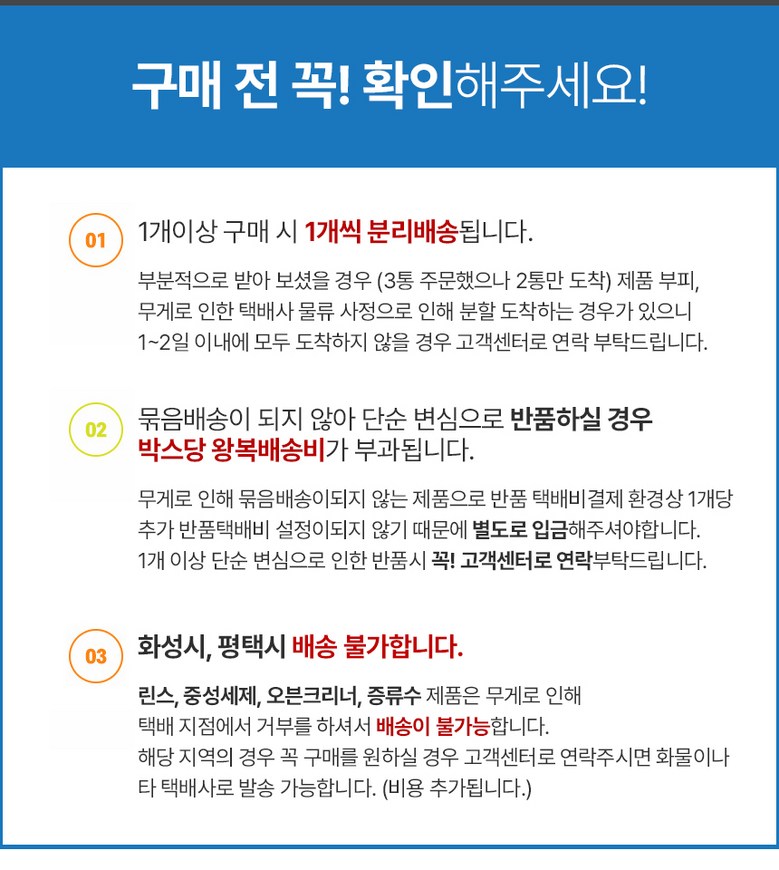 | 배송방법 | 순차배송 | 배송비 | 무료배송 - 도서산간 지역 배송불가 |