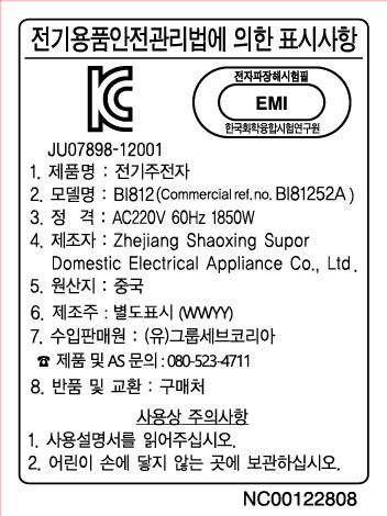 | 출시년월 | 2012년01월 | 제조자(수입자) | Zhejiang Shaoxing Supor Domestic Electrical Appliance Co., Ltd.(유)그룹세브코리아 |