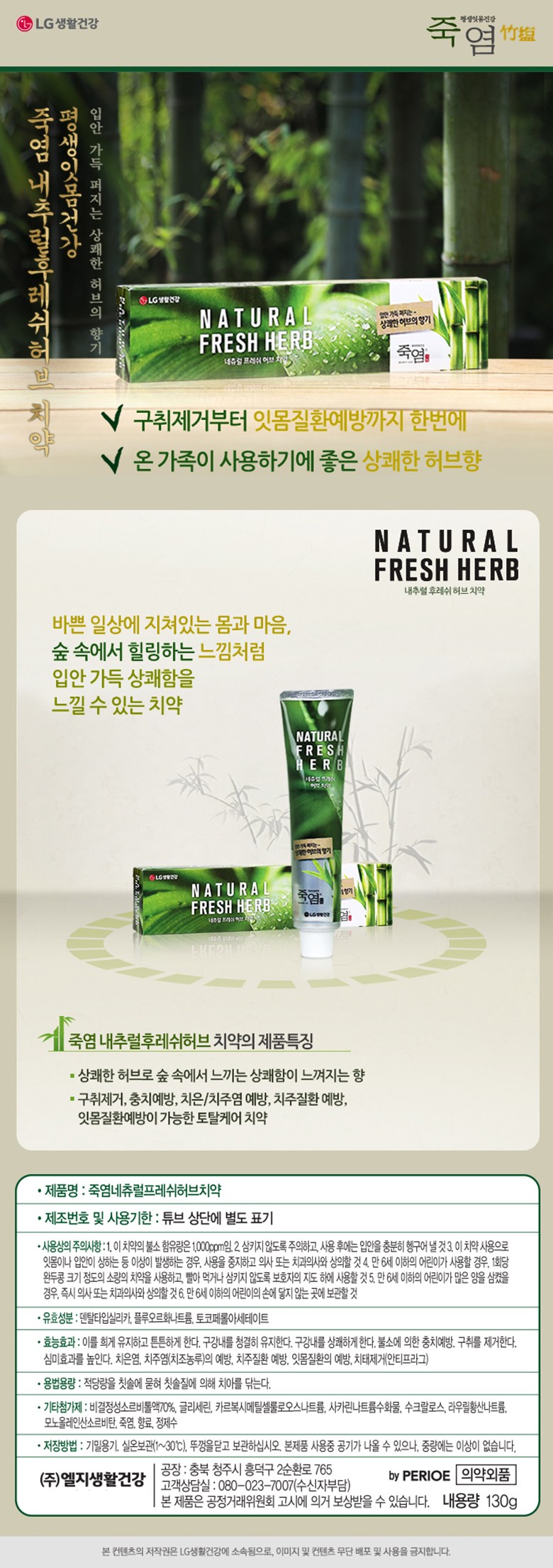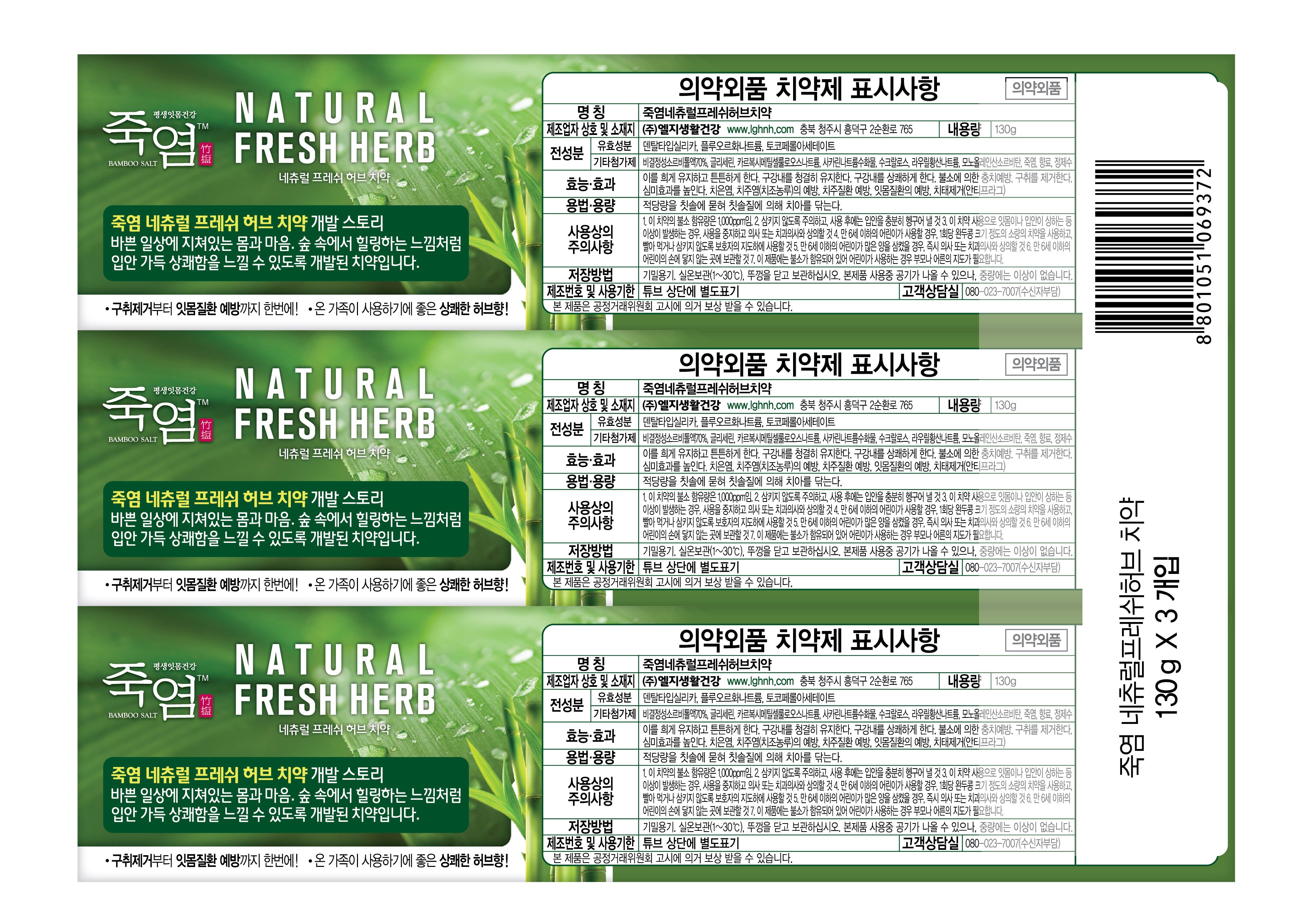 | 품명 및 모델명 | 죽염네츄럴프레쉬허브치약 | 인증/허가 사항 | 의약외품 |
