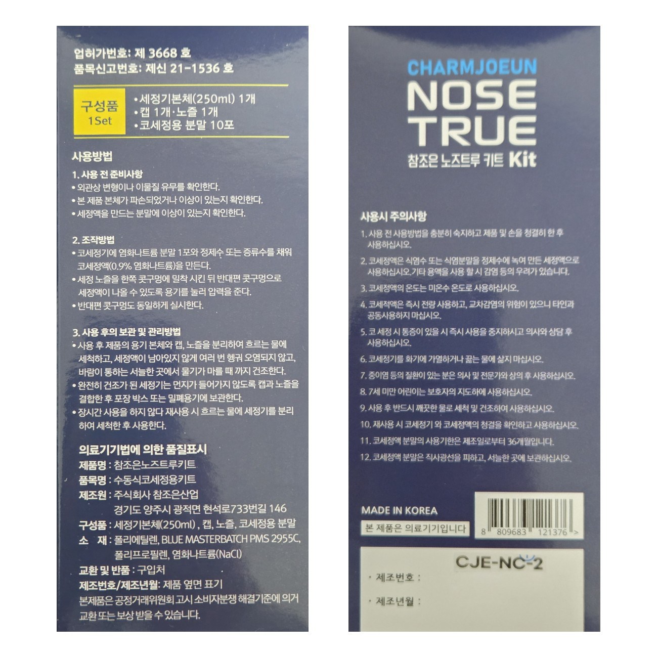 | 품명 및 모델명 | 수동식코세정용키트 / CJE-NC-2 | 허가∙인증∙신고번호 (의료기기법에 따른 허가∙인증∙신고 대상 의료기기에 한함) | 품목허가번호: 제신21-1536호 |
