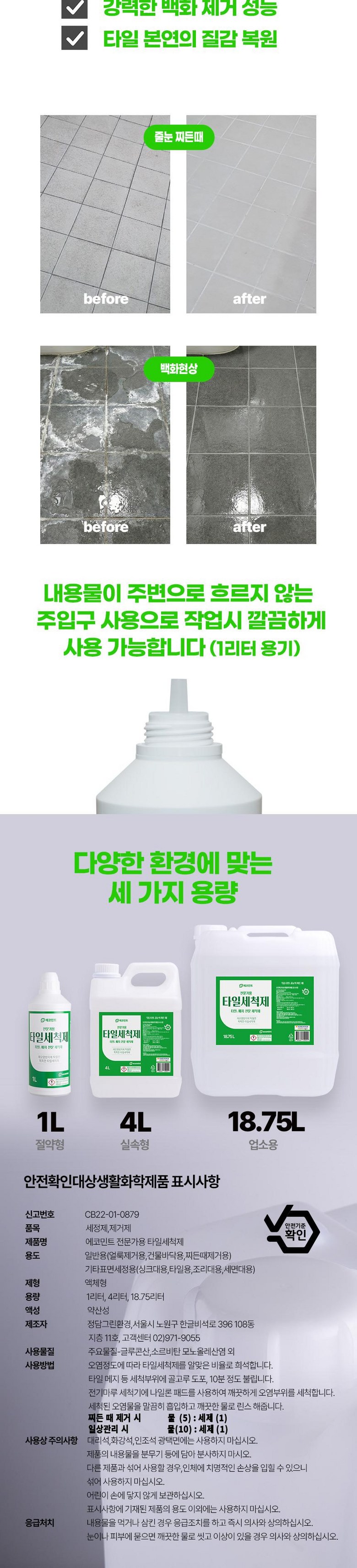 | 품목 및 제품명 | 품목 및 제품명:세정제, 에코민트 전문가용 타일세척제 | 용도(표백제의 경우 계열을 함께표시) 및 제형 | 용도:제거제(일반용(얼룩제거용,기타제거용(찌든때제거용)),세정제(일반용(건물바닥용)) |