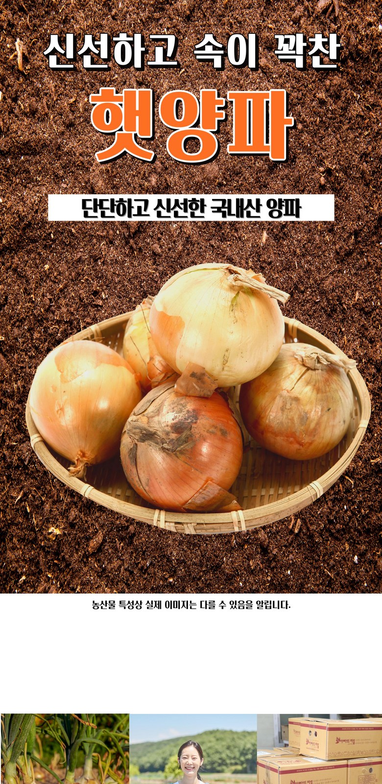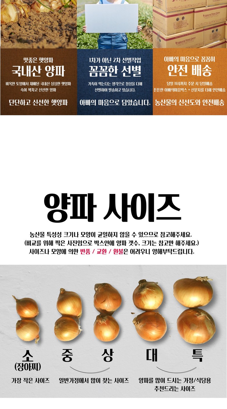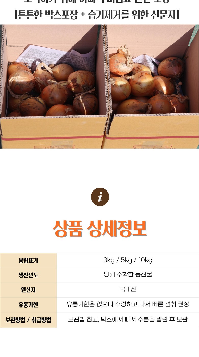 | 제조연월일, 소비기한 또는 품질유지기한 | 생산년도:당해년도 생산된 농산물 예)20년 생산된 농산물은 21년 햇양파시기까지 판매생산제조연월일:유통기한:농산물 특성상 설정이 어려우니 가급적 빨리 드시기 바랍니다 | 세부 품목군별 표시사항 | <농산물>1) 유전자 변형농산물 표시 -해당사항 없음2) 지리적표시 -해당사항 없음<수산물> 1) 유전자 변형수산물 표시 -2) 지리적표시 -<축산물>1) 등급 표시 -2) 이력관리 표시 유무 - |