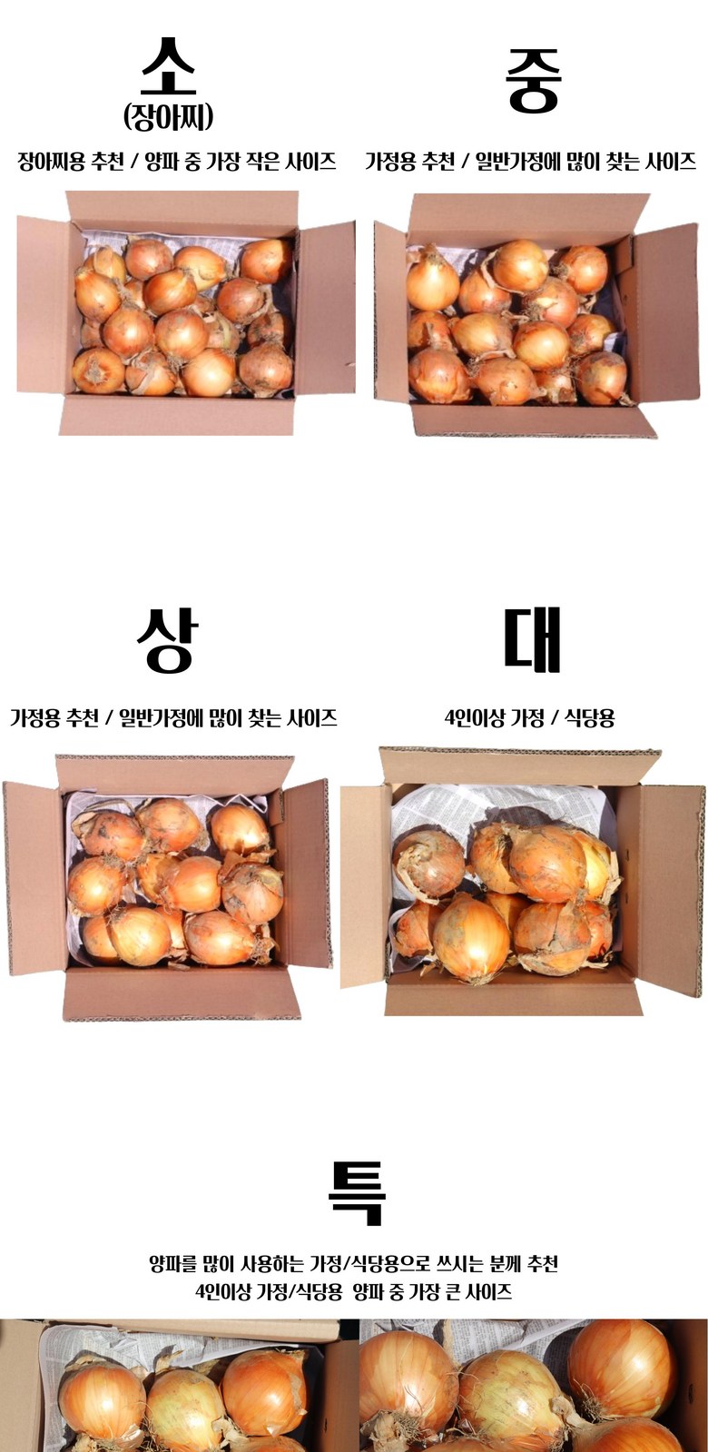 | 품목 또는 명칭 | 품목:양파 | 포장단위별 내용물의 용량(중량),수량,크기 | 3/5/10kg 각 시기별 가격에 따라 포장 중량의 변화가 있으며,등급마다 중량의 차이가 있어 정확한 개수는 힘듭니다중량마다 박스 규격이 다르며 박스포함 중량으로 발송이 됩니다중-120~160g 상-170~210g 대 220~300g 특 300g 이상 대략 입니다실중량 3kg-2.9kg 5kg-4.8kg 10kg-9.6kg |