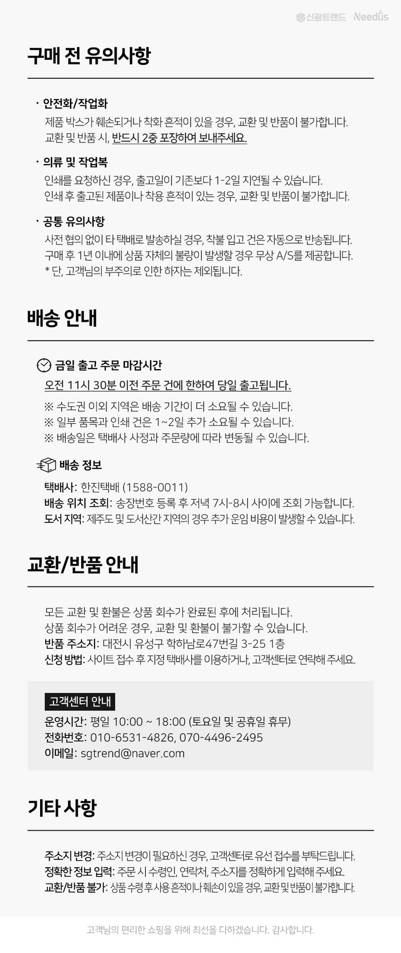 - ㆍ교환/반품에 관한 일반적인 사항은 판매자가 제시사항보다 관계법령이 우선합니다.