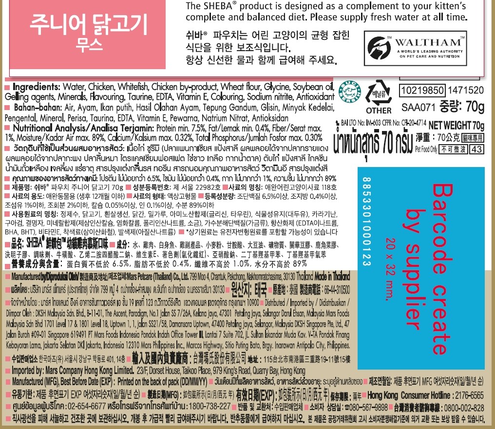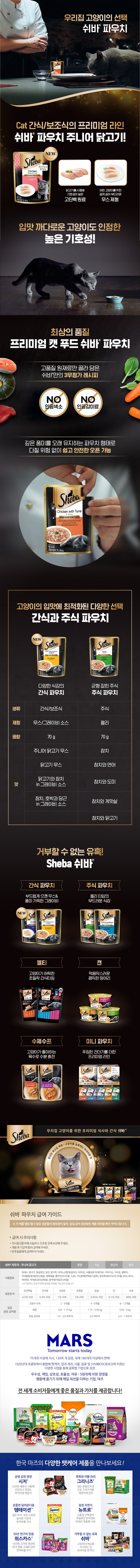 | 품명 및 모델명 | 쉬바 파우치 주니어 닭고기 70g | 인증/허가 사항 | 사료관리법에 따른 성분등록번호 : 컨텐츠 참조 |