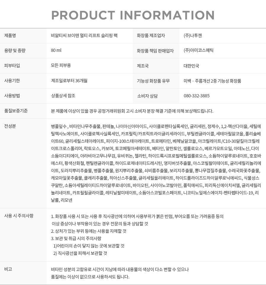 | 용량(중량) | 80ml | 제품 주요 사양 | 모든 피부용 |