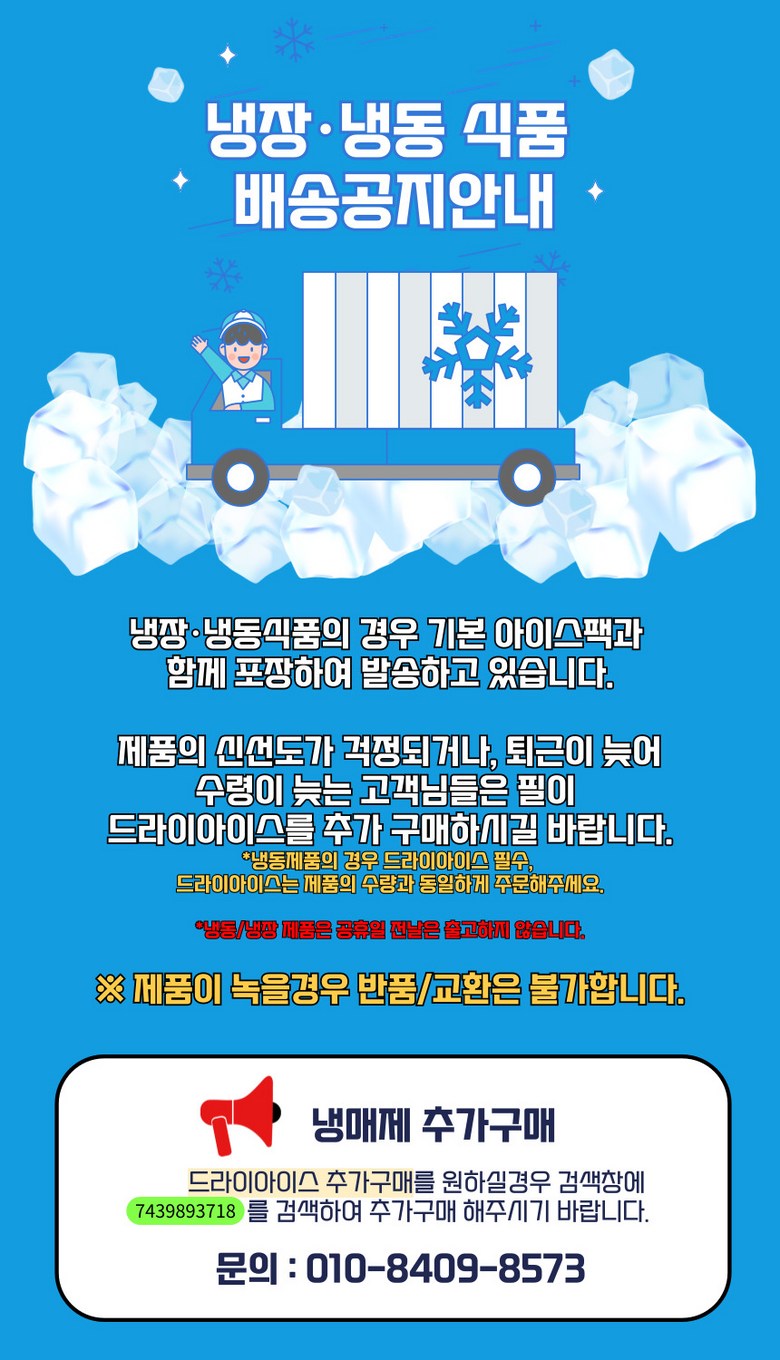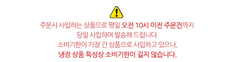 | 배송방법 | 신선/냉장/냉동 | 배송비 | 무료배송 · 도서산간 추가 배송비 - 제주 지역: 4,000원 - 도서산간 지역: 7,000원 |