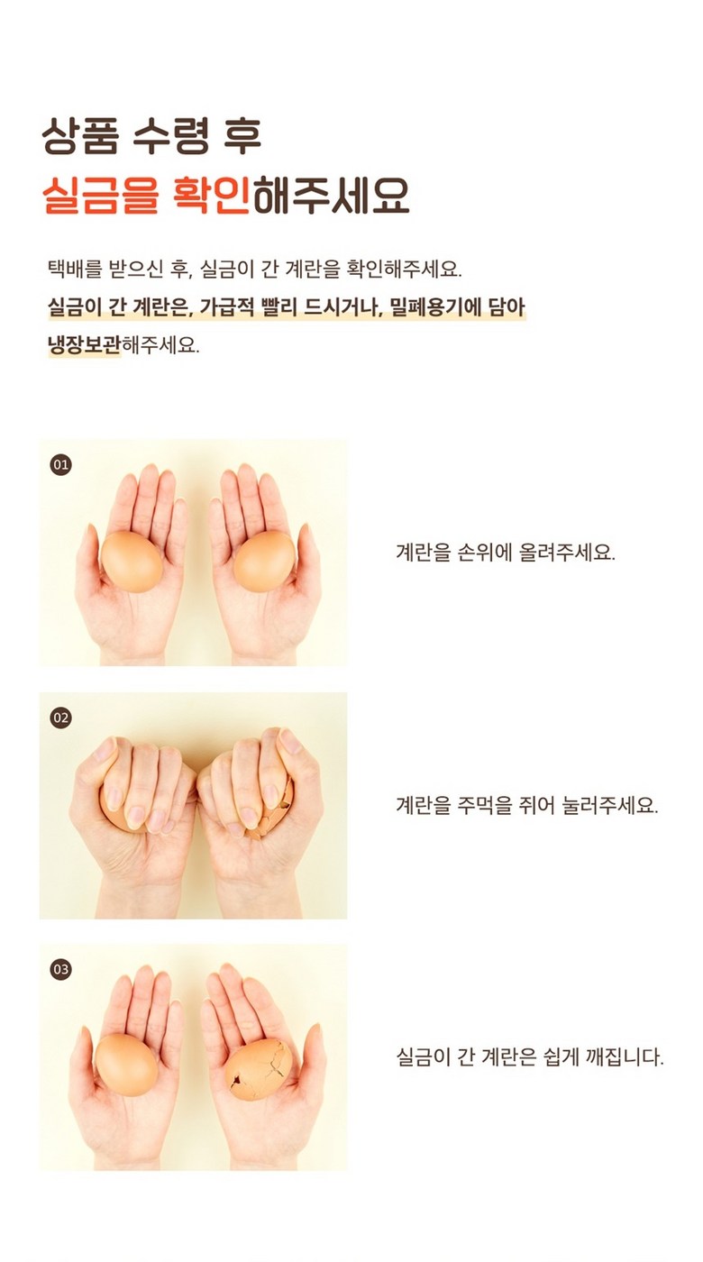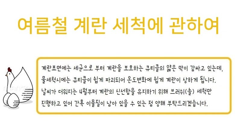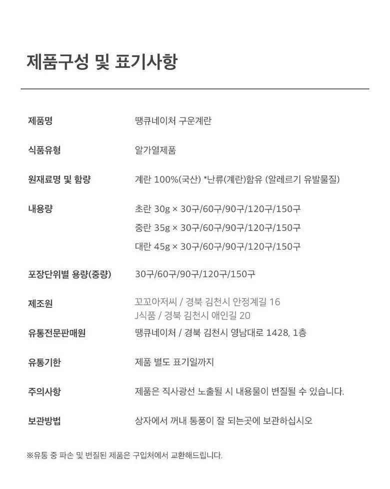 | 생산자(수입자) | 꼬꼬아저씨, J식품 등 협력업체 (자세한 생산자는 계란박스 안에 동봉되어 있는 전단지를 확인해주세요) | 원산지 | 국내산 |