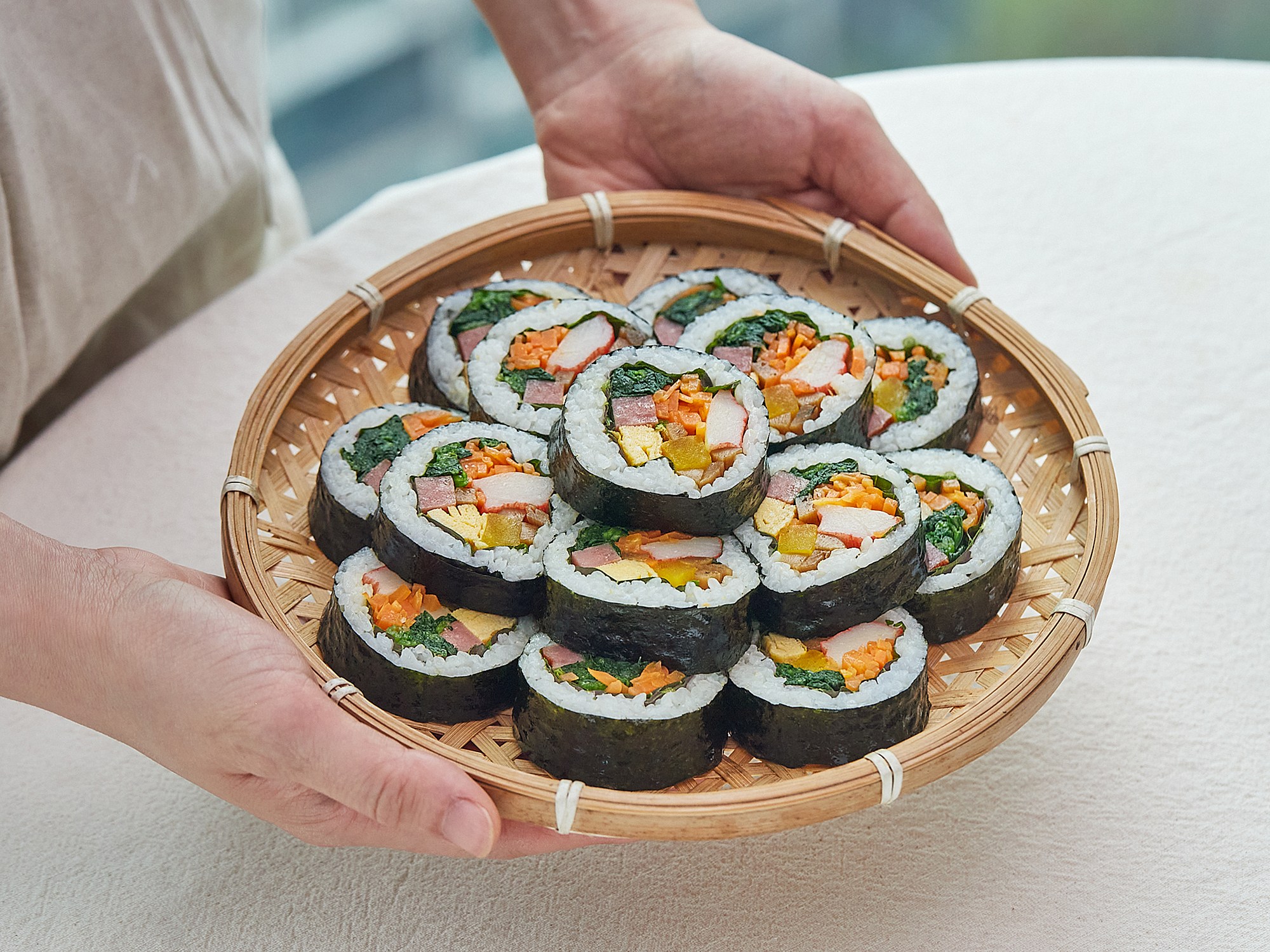 4. 김발로 모양을 잡아가며 김밥을 말아주세요.