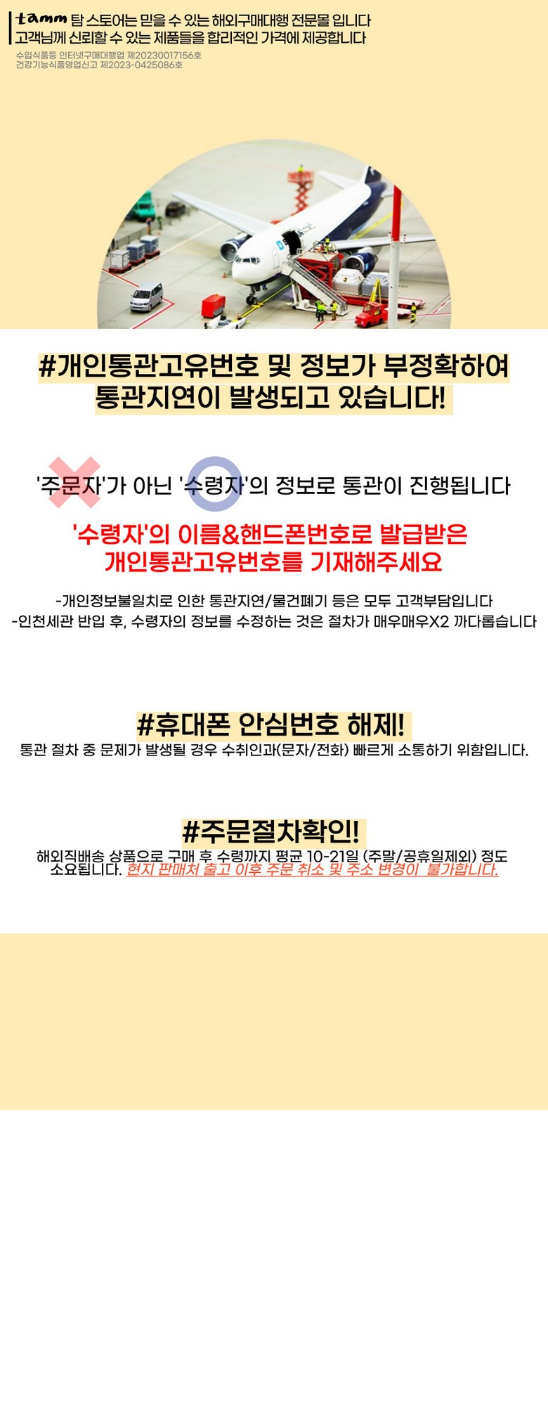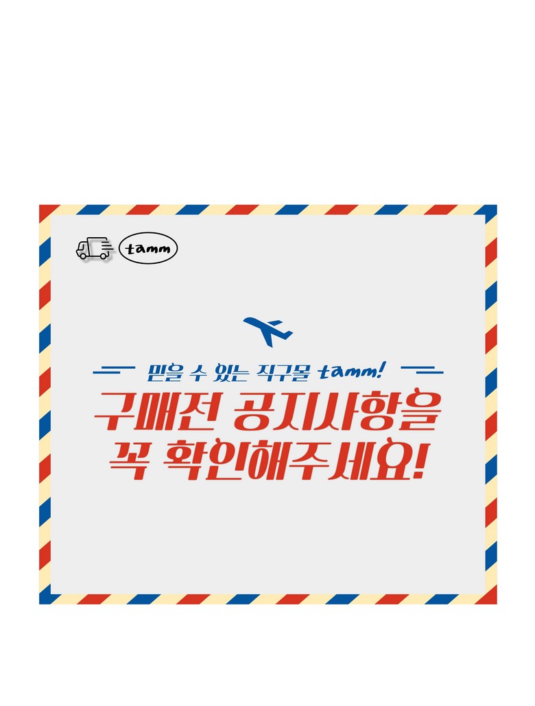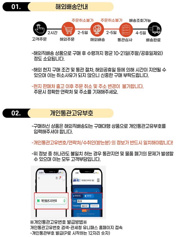 - 법규 개정에 따라 개인통관고유부호 검증 절차가 강화되었습니다. 결제 단계에서 받는 사람의 정보가 관세청 등록 정보 (성명, 휴대폰, 개인통관고유부호, 주소) 와 일치하는지 확인해주세요.