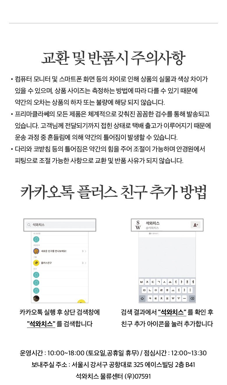 - ㆍ모니터 해상도의 차이로 인해 색상이나 이미지가 실제와 달라, 고객이 단순 변심으로 교환/반품을 무료로 요청하는 경우