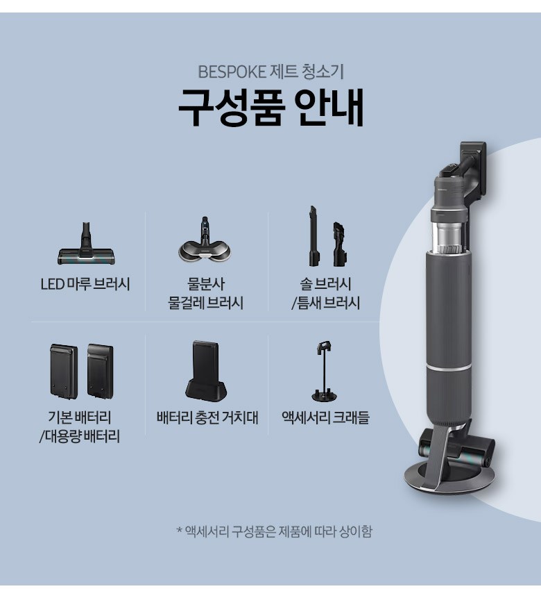 | 품명 및 모델명 | 삼성전자 BESPOKE 제트 AI 청소기 / VS28C973DRH | KC 인증정보 | 본체: R-R-SEC-VS9700C / 핸디 BLE 모듈: R-R-WHS-ML60-001 / 일체형스테이션: JU071421-23002, R-R-SEC-VS9700C_DS / 전기충전기-배터리충전기용: JU071683-21001, R-R-SEC-A3630K_TPN, 무선기기 : R-C-SEC-CCAR210R |